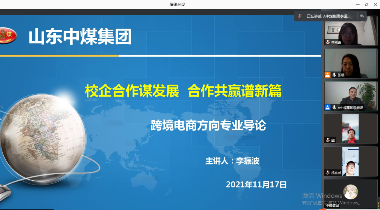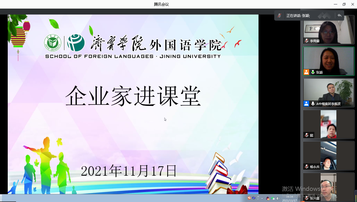 11月17日下午,外国语学院举行“企业家进课堂”活动,邀请中煤集团常务副总经理兼信息化总经理李振波通过腾讯会议作了题为“校企合作谋发展,合作共赢谱新篇”的讲座。该活动由外国语学院副院长张颖主持,外国语学院副院长张殿海、商务英语教研室全体教师以及2019级、2020级、2021级商务英语专业全体学生参加了讲座。