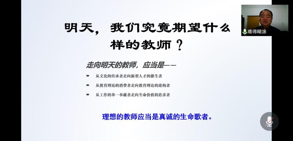 11月18日晚,外国语学院邀请曲阜市教师教育发展服务中心宋玉忠老师于腾讯会议线上为该院师生作了题为“走专业化之路,体验职业的幸福与快乐---教师职业发展前景解析”的讲座。外国语学院英语师范生教师教育导师团、2019级、2020级和2021级英语师范专业学生80余人参加了此次活动。