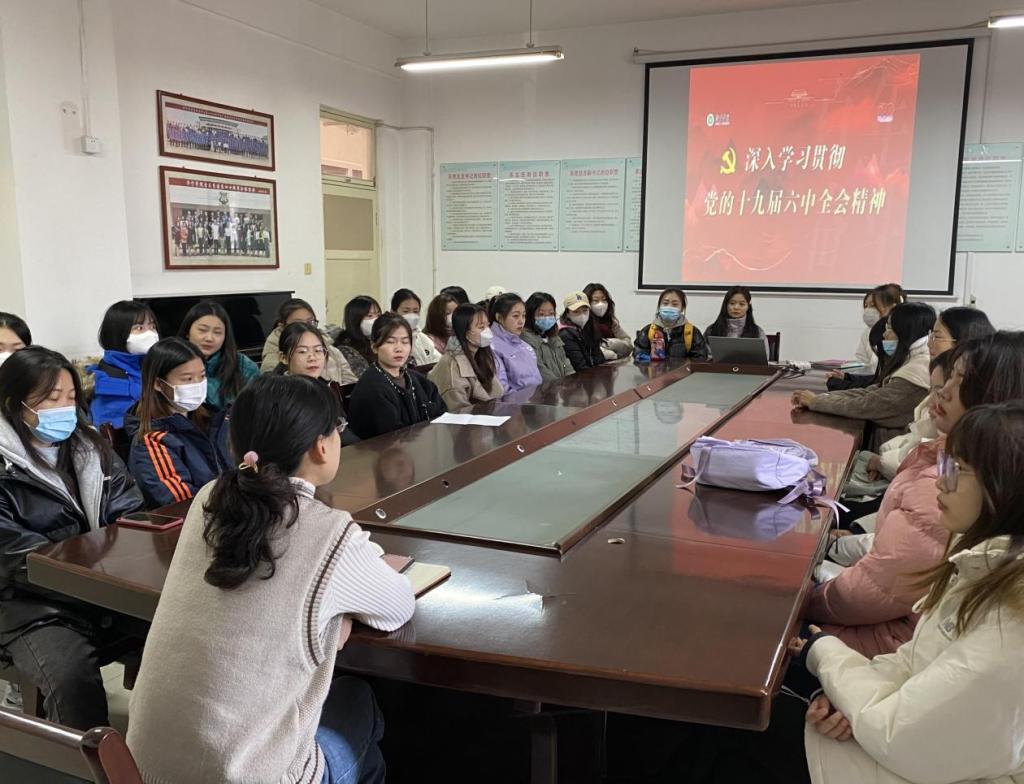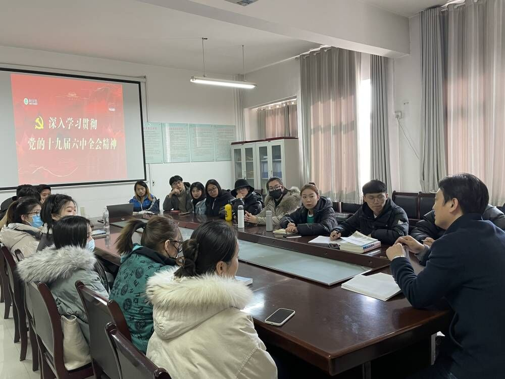 11月15日,音乐学院学生党支部组织全体党员在二楼会议室开展学习党的十九届六中全会精神专题党课。