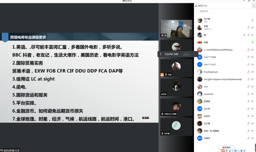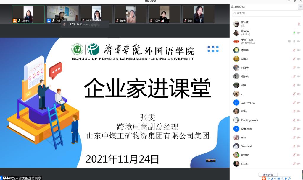 11月24日下午,外国语学院举办的“企业家进课堂”系列讲座迎来了第二位企业家嘉宾,中煤集团跨境电商副总经理张雯通过腾讯会议为外国语学院师生作了题为“传统贸易与跨境电商的结合”的精彩讲座。该院副院长张颖主持了本次活动,该院副院长张殿海、商务英语教研室全体教师以及2019级、2020级、2021级商务英语专业全体学生百余人参加了本次讲座。