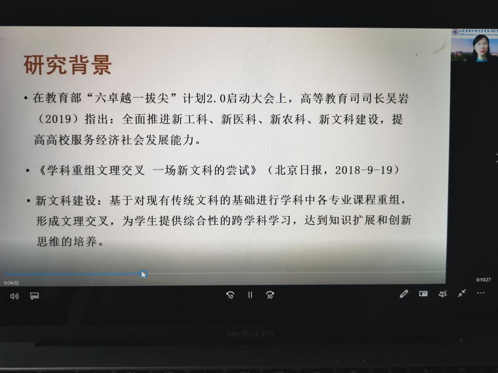 外国语学院教师也积极参与学会各分论坛学术交流。其中,刘晶老师参加了分论坛并做了题为《新文科背景下大学英语课程思政元素需求分析调查研究》的发言。她首先介绍了新文科建设为大学英语教学改革和发展提供了契机,并分享了大学英语课程思政元素需求分析的一项调查研究,从概念界定、研究设计、研究发现、启示等方面进行了交流。