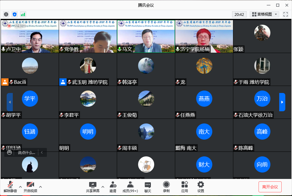 山东省国外语言学学会2021 年年会于11月26日至28日在潍坊学院召开。学会副会长、我校外国语学院名誉院长卢卫中教授,外国语学院院长杨楠,副院长张殿海、张颖,刘晶等17名教师参加会议。