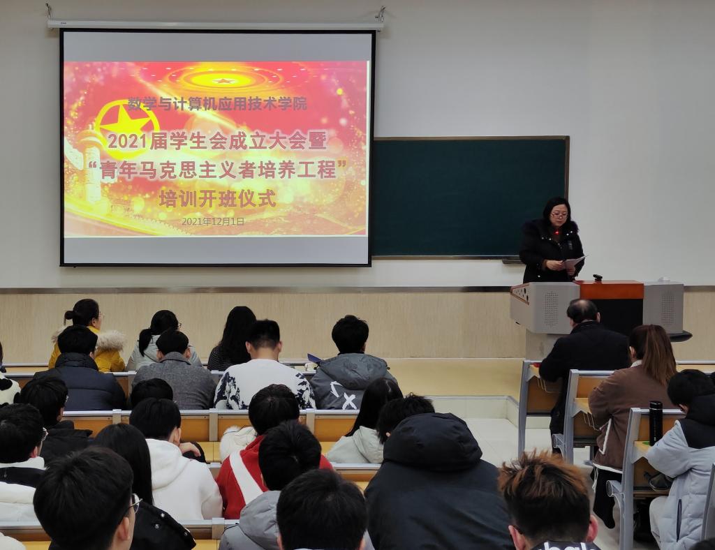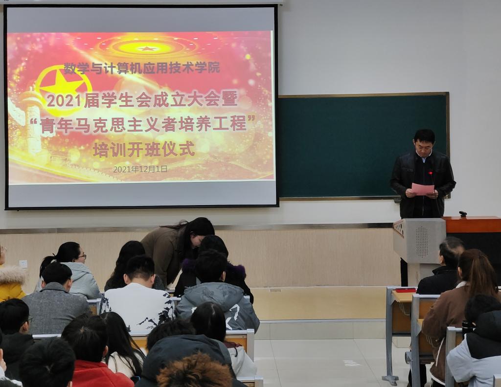 12月1日晚,数学与计算机应用技术学院在9号楼D201成功开展2021届学生会成立大会暨“青年马克思主义者培养工程”开班仪式。该院党委书记许杰、团委书记冯秉政、辅导员,及各班学生干部、学生会主要负责人参加。