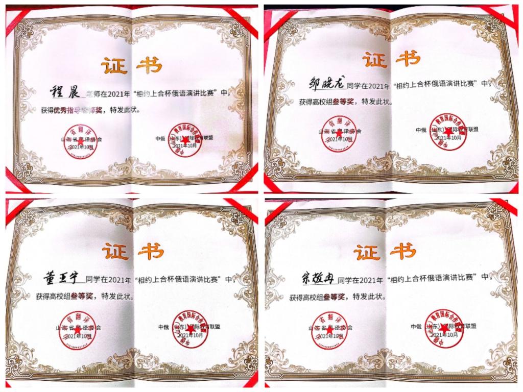 “相约上合杯”俄语演讲大赛是山东省外办策划的“相约上合”品牌交流活动的人文教育版块内容,是落实《省外办关于服务中国—上海合作组织地方经贸合作示范区建设的意见》,为上合示范区建设提供人才和智力支持的重要举措。全国大学公外俄语线上线下混合式教学俄语书写大赛由全国大学俄语教学研究会主办,北京航空航天大学、高等教育出版社承办。在“一带一路”倡议不断走向深入的大背景下,俄语作为沿线国家重要战略语种,始终在我国对外事业中扮演着举足轻重的作用,俄语人才的需求也日益增加。参加各类俄语技能比赛不仅为学习俄语的学生提供了互相交流、展示自身学习成果的平台,同时也以此为契机,进一步开阔同学们的视野,在培养和发现俄语优秀人才方面起到了积极作用。