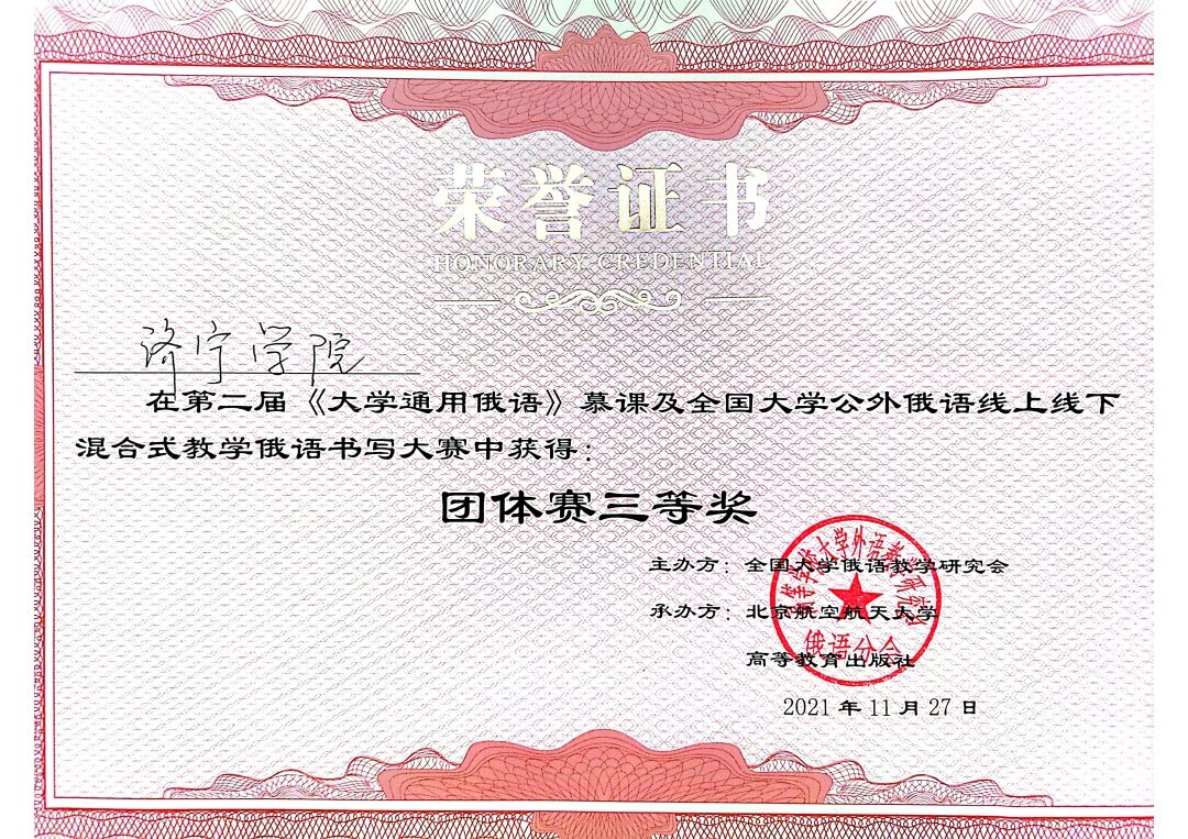 近日,我校学生在国内高校俄语演讲和书写比赛中获得佳绩。10月29日至30日,第二届“相约上合杯”俄语演讲大赛高校组复赛在线上举办,由中俄专家、教师进行在线评审,来自全省40多所高校的88名选手参加了角逐。我校外国语学院程晨老师指导数学与计算机应用技术学院的董亚宁、教师教育学院的邹晓龙和儒商学院的宋敬冉三位同学参加比赛并荣获三等奖。11月10日至20日,第二届全国大学公外俄语线上线下混合式教学俄语书写大赛在线上举行。经过外国语学院的积极组织与动员,共收到来自全校各院系、专业的32名公外俄语学生参赛作品五十余份,其中不乏精品。经过专业教师的选拔与比较,选出十份作品参加最后的角逐。最终,我校获得团体赛三等奖的好成绩。