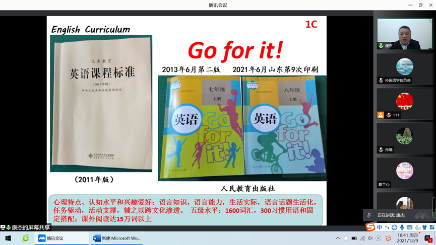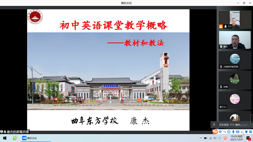 为进一步提高师范生教育教学技能,促进理论教学与实践教学的有机融合,12月9日晚,外国语学院名师进课堂活动邀请到了曲阜东方学校副校长康杰为外院师生做了题为“初中英语课堂教学概略---教材和教法”的讲座。因疫情缘故,本次讲座通过腾讯会议采取了线上课堂的形式。讲座由该院英语专业师范方向负责人吴瑞民主持,英语师范生教师教育导师团,2019级公费师范生和2021级英语专升本(师范方向)学生,共计150余人聆听了本次讲座。