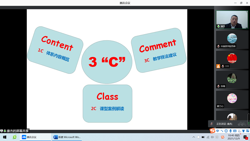 康杰从教材和教法两个维度出发,以英语课堂教学的3”C”(Content, Class, Comment)为主线,围绕英语课程标准,基于现行英语教材,结合自身教学经验,为同学们带来了一场深入浅出的报告。