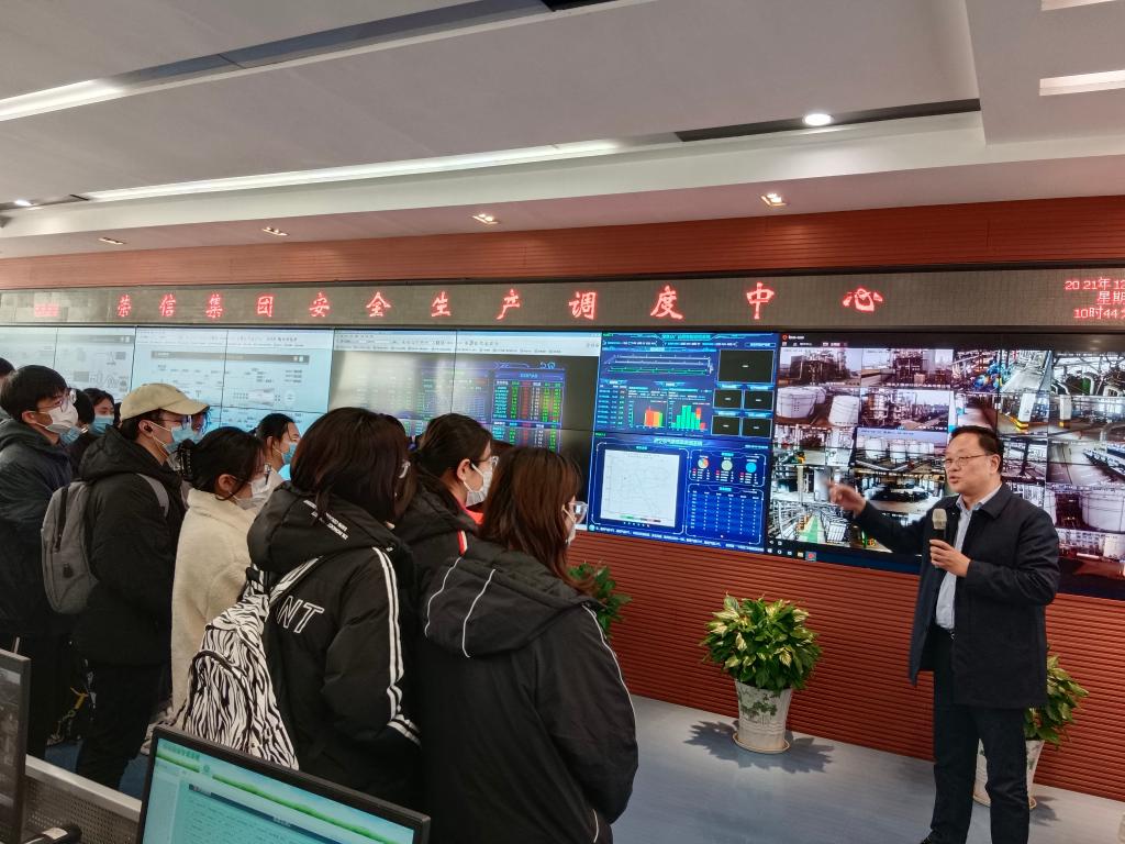 上午,同学们首先参观了被国家工业和信息化部授予“绿色工厂”和能效“领跑者”称号的山东荣信集团有限公司的生产厂区。参观过程中,工作人员介绍了企业的主要产品、生产工艺、产能规模,增加了学生对企业的宏观认识;然后同学们参观了企业调度室,企业负责人和工作人员依托调度室工艺流程图,详细介绍了企业的工艺流程,加深了学生对专业知识的理解;随后学生参观了集“接收、宣传、服务、应急、调度”等功能于一体的“济舟港湾”,了解企业产销线路的同时,进一步理解了体系化管理的理念。下午,企业召开专题报告会,播放企业宣传片,全面系统地介绍企业的发展历程、运营情况、企业理念、企业文化;同时与同学们进行了一对一的交流,详细解答了同学们提出的问题。