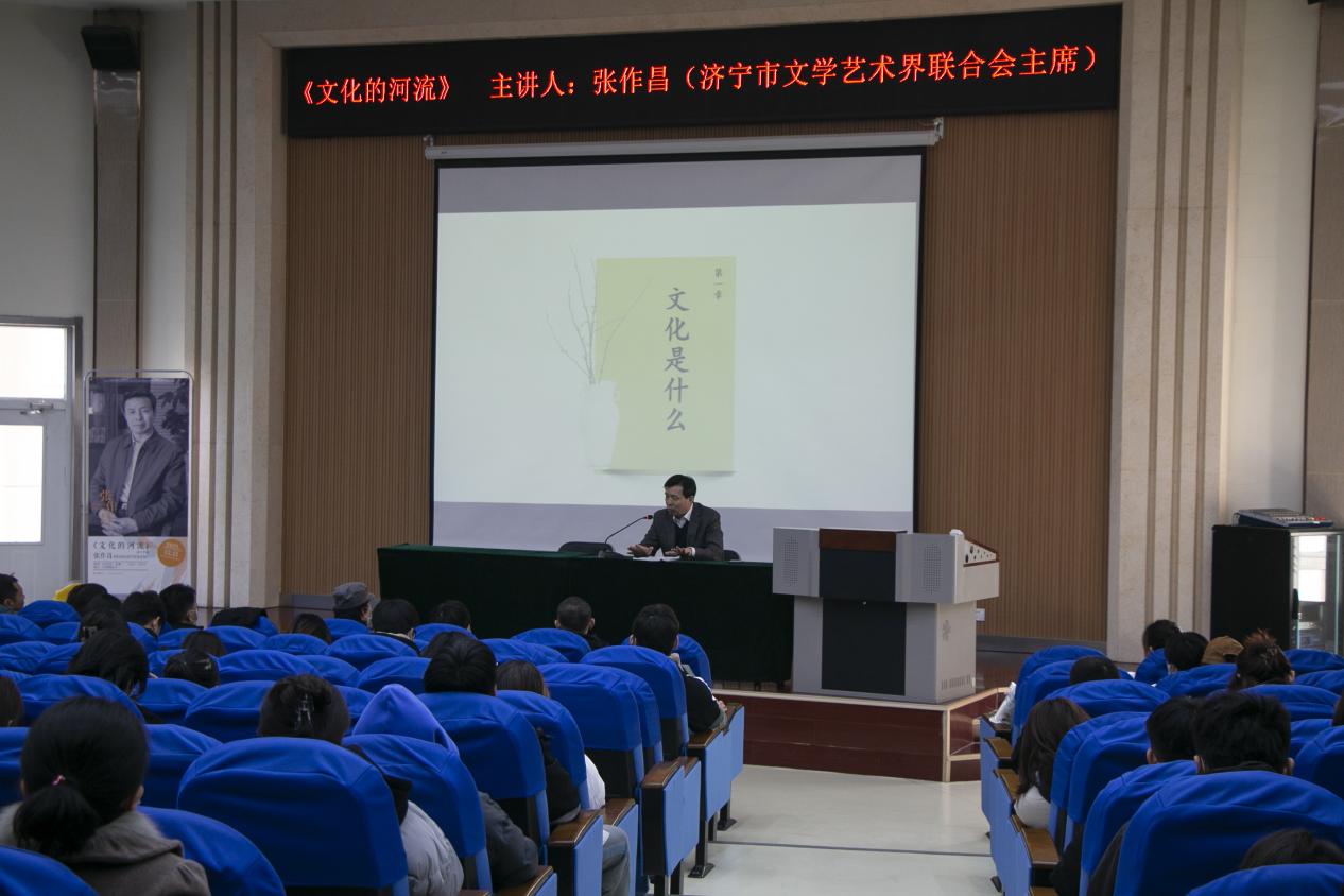 12月21日上午,济宁市文联党组书记、主席张作昌为我校美术学院作“文化的河流”专题讲座。美术学院党委书记杨晓青、副书记孔翠、教师代表和相关学者嘉宾参加,该院副院长张继华主持。