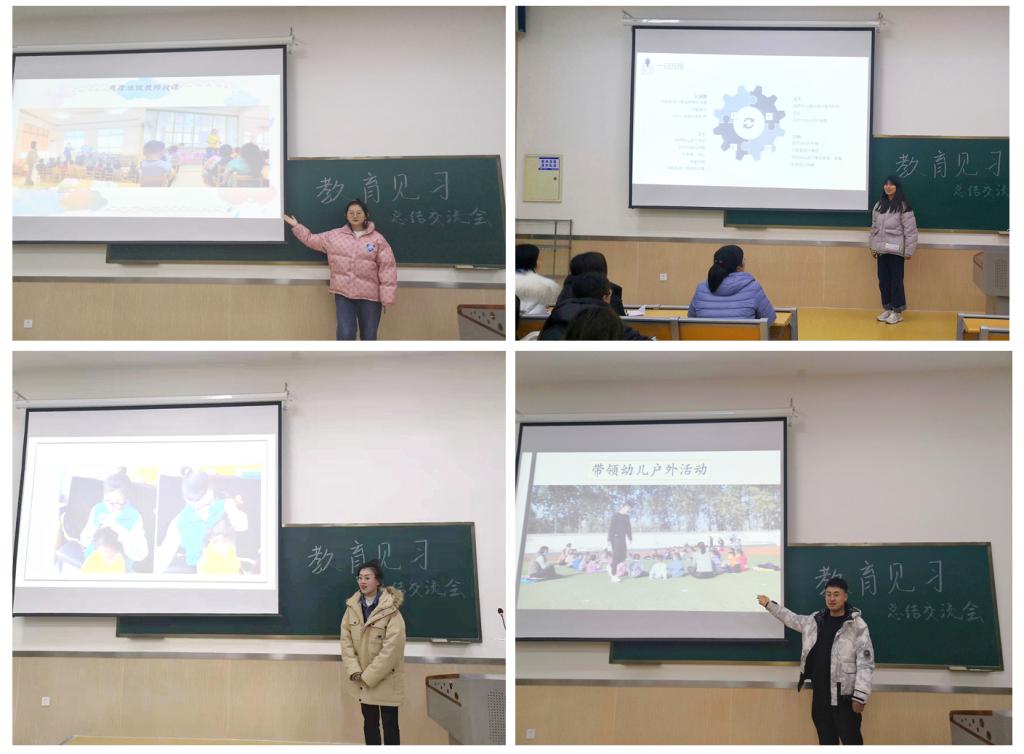 交流会上,共16位同学代表各自小组进行了教育见习汇报。同学们通过生动详实的资料,汇报了各自见习幼儿园的园所环境、师生风貌和保教活动。同学们纷纷表示,通过参观幼儿园的教育教学环境,感受到了不同特色的幼儿园文化,切实体会到了环境育人的教育理念;通过协助幼儿园教师开展各类活动,了解了幼儿园工作常规;通过“跟师”听课、观摩教学活动,丰富了对教育教学实践的认识,加深了对所学教学理论的理解,增进了职业理解与职业认同。