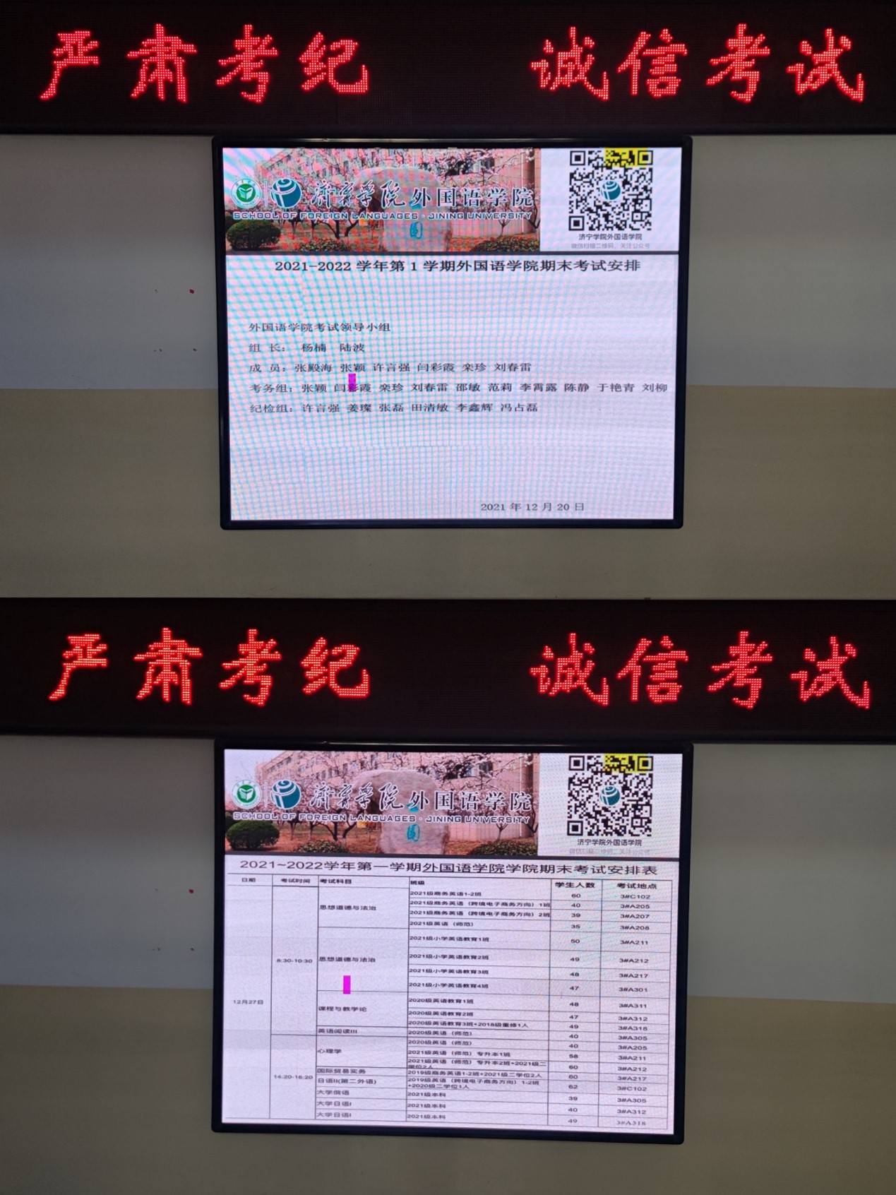 为了加强考试管理,严肃考风考纪,外国语学院成立了以院长杨楠、书记陆波为组长的考试领导小组,下设考务组、纪检组。考试前专门召开全体教职工会议,就期末考试各项工作进行了详细安排部署,强调考试纪律和要求,切实做到职责明确、责任到人。同时,组织学生召开诚信考试主题班会,签订考试承诺书,该院电子屏滚动播出考试信息和诚信考试宣传内容,营造良好的考试氛围。