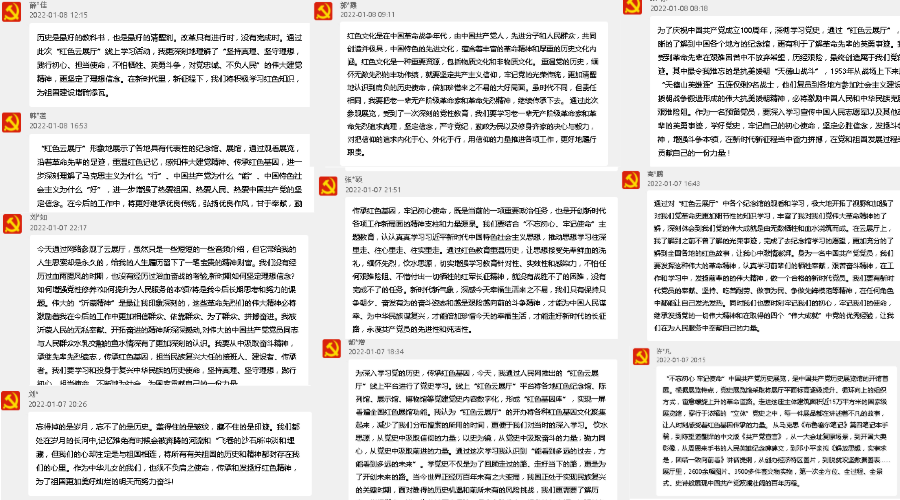 活动中,师生们“云参观”了中共一大纪念馆、延安革命纪念馆、遵义会议纪念馆、沂蒙革命纪念馆等红色展馆。通过一屏云游览红色展馆,大家沉浸式、全方位重温了党的峥嵘岁月,回顾了党的光辉历程,并在观看后交流了心得体会。该院党委副书记韩西莲表示,通过观看展览,进一步增强了热爱祖国、热爱人民、热爱中国共产党的坚定信念,在今后的工作中,将更好地继承优良传统,弘扬优良作风,甘于奉献,勤奋工作,为推动学校高质量发展作出新的更大贡献;党员袁子茵表示,通过观看,真切了解了那一时期发生的可歌可泣的动人故事,对党在革命时期的奋斗历程有了更深刻的认识,更加坚定了为共产主义事业奉献的决心;入党积极分子高硕表示,“弄清楚从哪儿来”需要重温红色经典,“弄清楚往哪儿去”需要勇于担当使命,我们要用实际行动传承红色基因,从先辈手中接过历史接力,铭记历史、砥砺奋进。