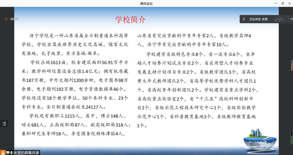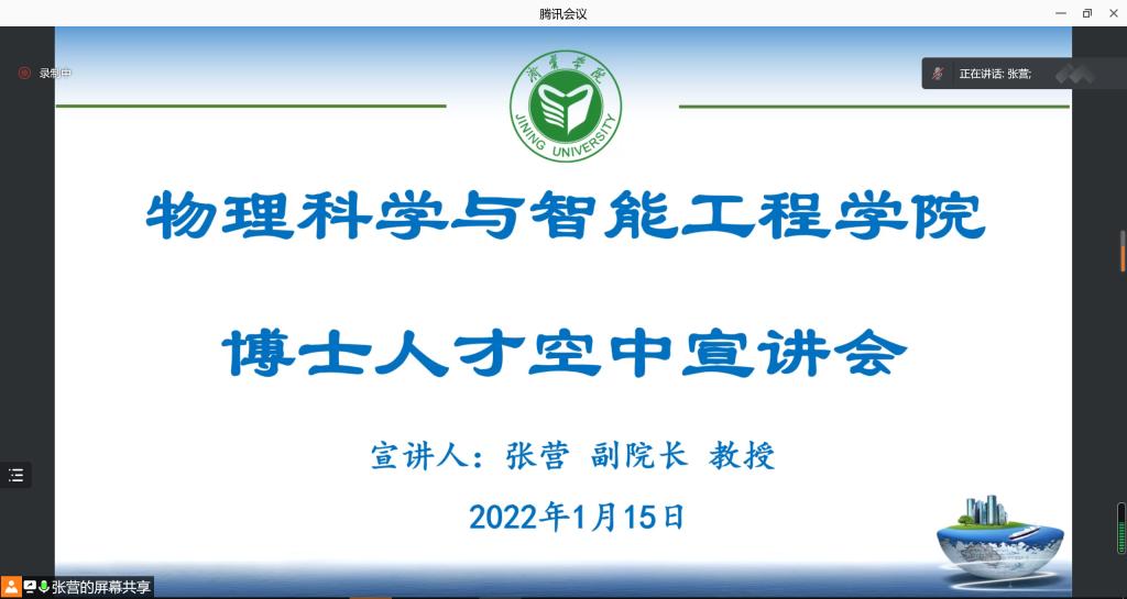 1月15日,物理科学与智能工程学院举行博士人才空中宣讲会,来自山东大学、陕西师范大学、上海科技大学、兰州大学的5名应届博士生参加了宣讲会,该院各教研室主任参会,会议由该院副院长张营主持。