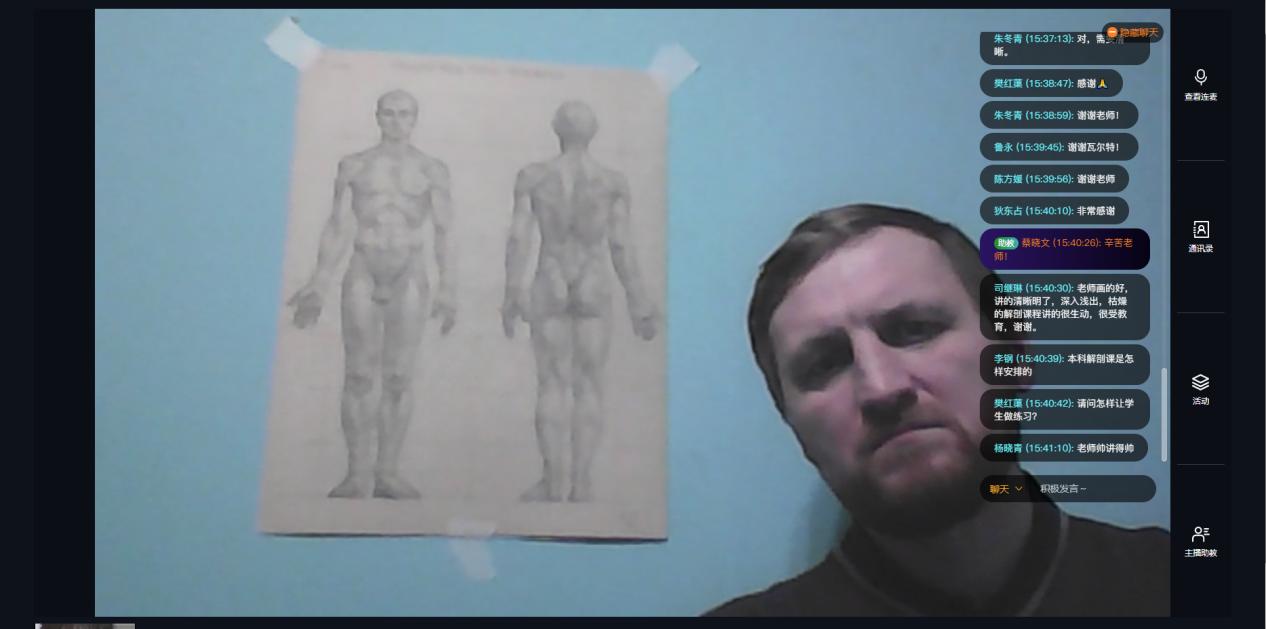 为提升学科体系,打造专业亮点,1月21日下午,我校美术学院特邀俄罗斯列宾美术学院专家,亚历山大▪亚历山德罗维奇▪费奥多罗夫通过《师训宝》教学平台开展《人体解剖学》专业技能课程线上授课与学术交流活动。该院党委书记杨晓青,副院长司继琳、张继华,美术学专业全体老师参加。