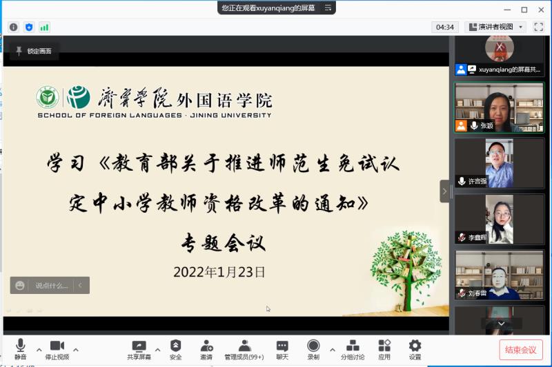 为响应教育部关于推进师范生免试认定中小学教师资格改革,吸引优秀人才到中小学任教,1月23日晚,外国语学院利用腾讯会议召开《教育部关于推进师范生免试认定中小学教师资格改革的通知》专题学习会议。外国语学院党委副书记许言强、副院长张颖、教学秘书刘春雷、全体辅导员、2022届及2023届本科师范毕业生参加。