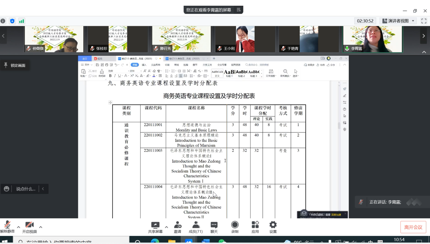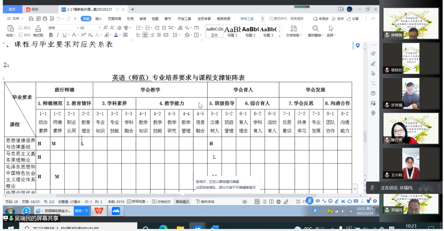 接着,英语师范专业负责人吴瑞民和商务英语教研室主任李霄露分别就英语专业(师范)和商务英语专业人才培养方案的修订点进行了细致的解读。吴瑞民围绕“学生中心,产出导向,持续改进”师范专业认证理念,重点从专业培养目标、毕业要求、课程设置、课程与毕业要求对应关系等方面汇报。李霄露按照“培养什么样的人,怎样培养人”的思路,就商务英语专业人才培养方案的主要内容及修订过程遇到的困惑、问题同全体老师开展了交流、探讨。