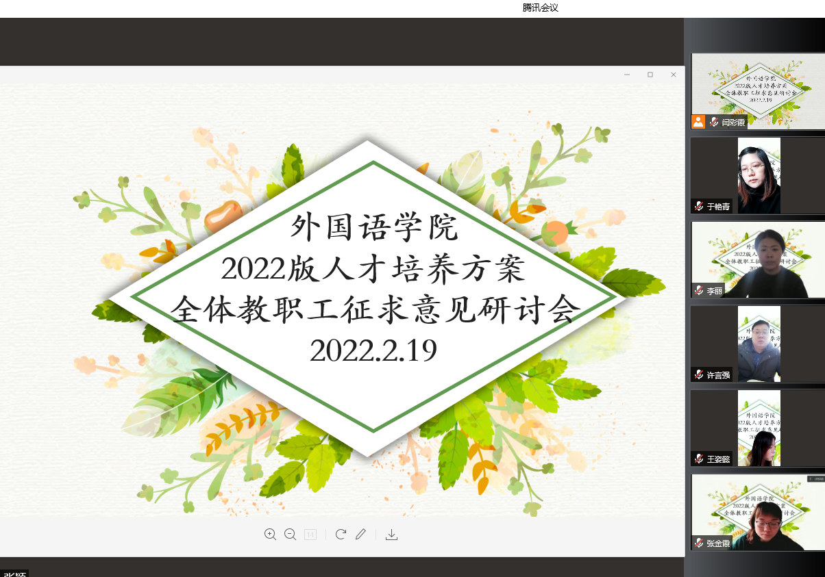 2月19日上午,外国语学院召开2022版人才培养方案全体教职工征求意见研讨会。“雨水”时节,全体教职工相聚腾讯会议,共话育人新方案。研讨会由该院院长杨楠主持。