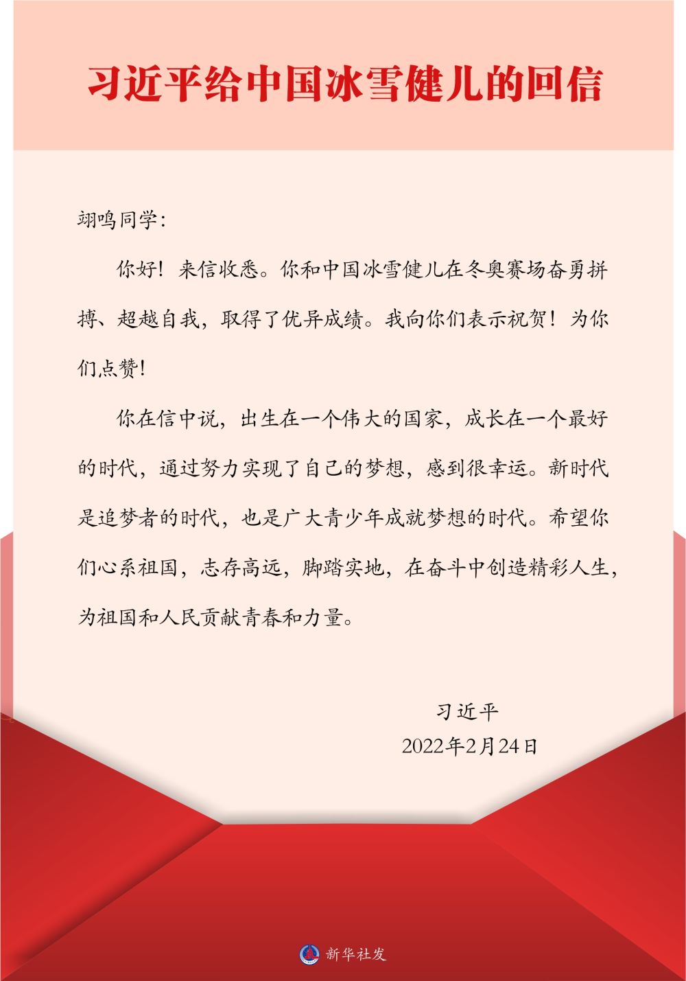 近日,习近平总书记给中国单板滑雪运动员苏翊鸣回信,向他和中国冰雪健儿取得优异成绩表示祝贺,并对青年人提出殷切期望。总书记指出,新时代是追梦者的时代,也是广大青少年成就梦想的时代。希望青年人心系祖国,志存高远,脚踏实地,在奋斗中创造精彩人生,为祖国和人民贡献青春和力量。