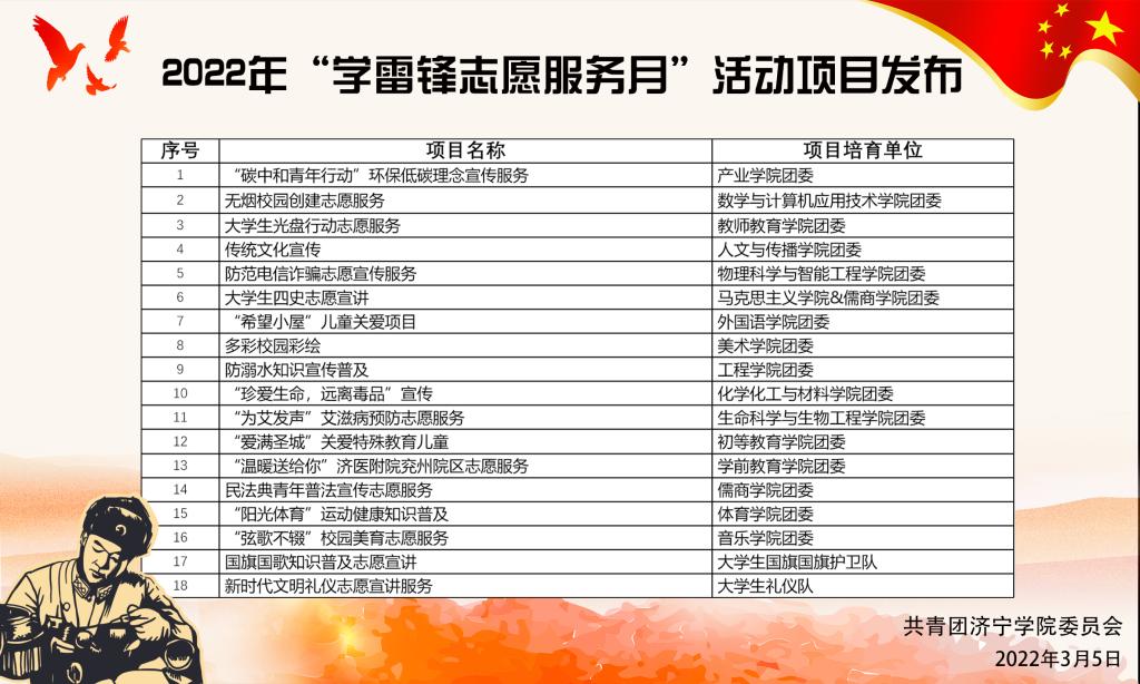 3月5日是全国第59个“学雷锋纪念日”,也是第23个“中国青年志愿者日”,我校团组织在生活区广场举行了2022年亚星在线登录官网“学习雷锋,众‘志’成城”志愿服务项目发布活动。