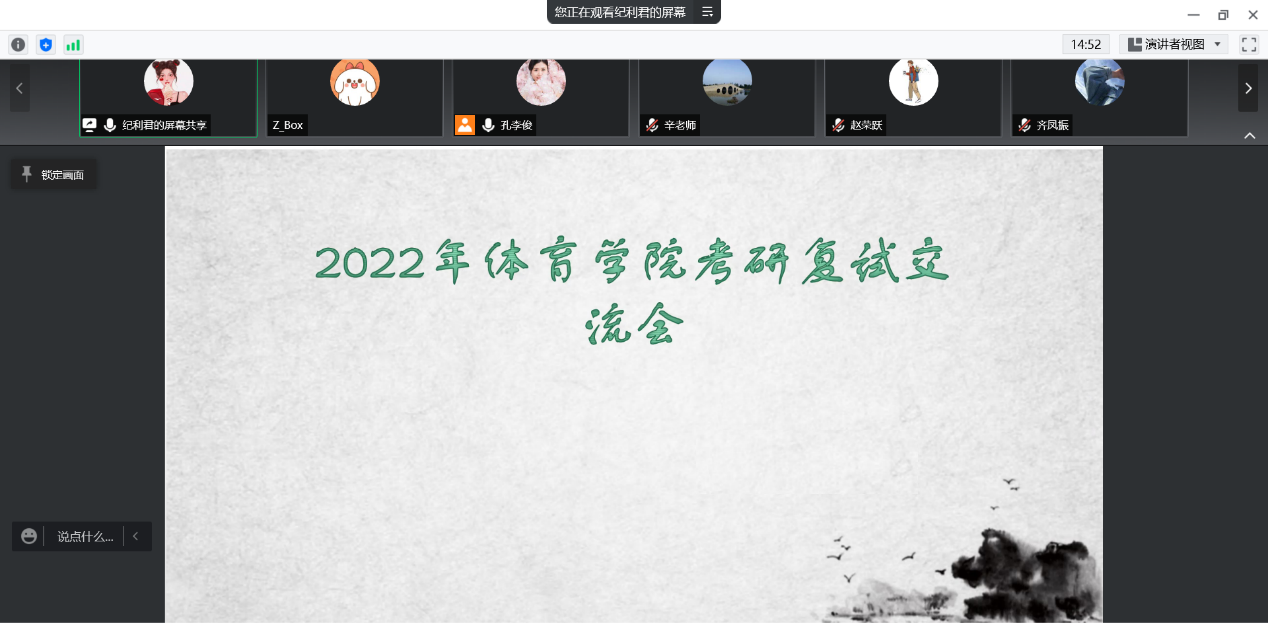 3月18日晚,体育学院通过腾讯会议举办线上考研经验交流会。会议由该院党委副书记辛允东主持,邀请2021届优秀毕业生代表纪利君、赵荣跃、江梦倩作了交流分享,辅导员孔李俊及正在备考的2022届毕业生及其他年级学生参加会议。