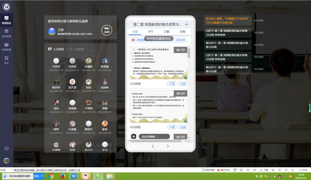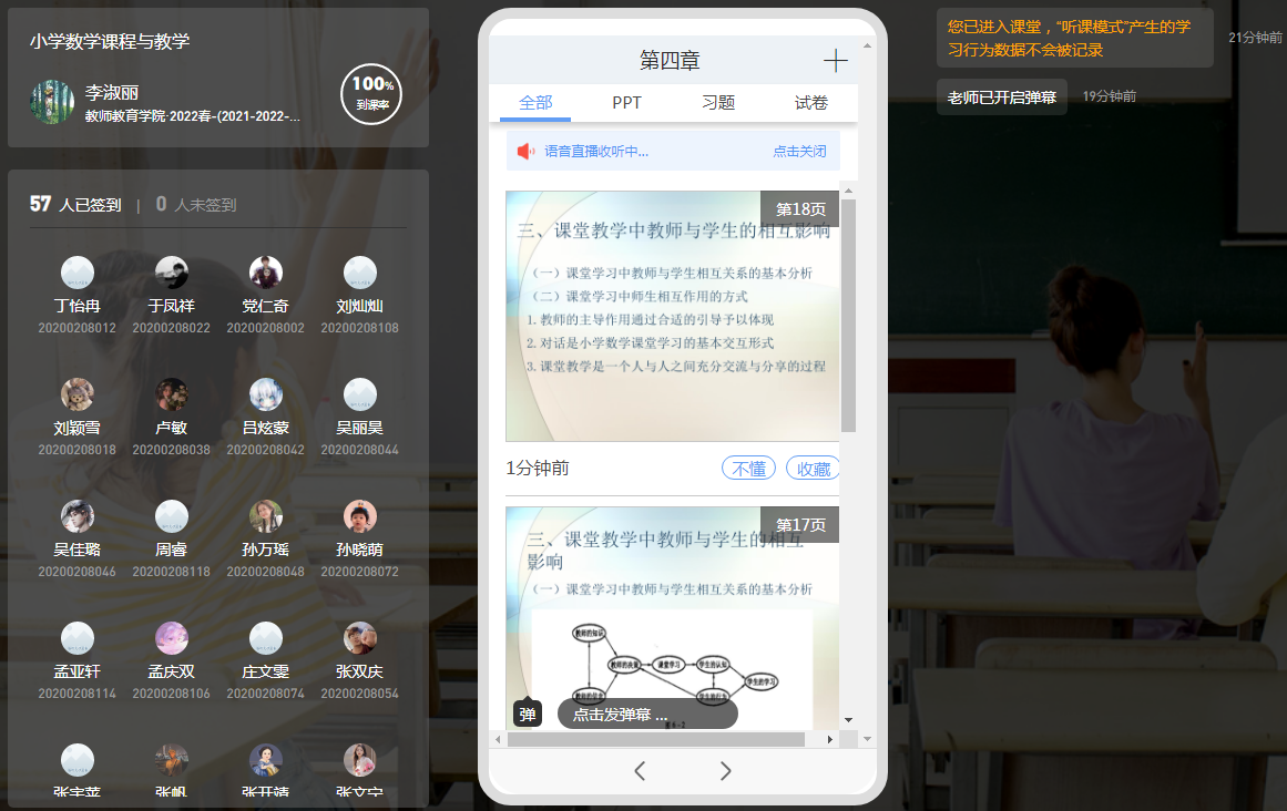 截至目前,该院全体老师均已上线开课,实现了本学期所有课程在线教学的全覆盖。其中,教师教育课程在线开设门次52门,专业课程在线开设门次168门,采用雨课堂、超星、智慧树等多种形式的直播平台,真正实现了线下线上课程教学的无缝衔接。