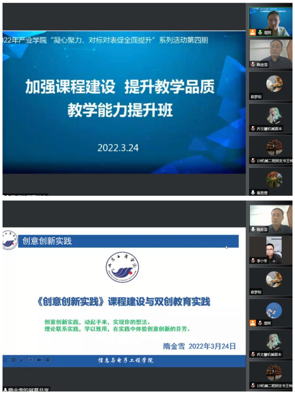 3月24日下午,产业学院通过线上会议召开2022年“凝心聚力、对标对表促全面提升”活动第四期——课程建设与双创教育能力提升培训班,会议请到了国家一流课程负责人隋金雪作主题为“《创意创新实践》课程建设与双创教育实践”的报告,产业学院全体教职工,各专业学生创新实验室成员,各班班长、团支书、学习委员等参加会议。隋教授任山东工商学院信息与电子工程学院副院长,所教授的《创意创新设计实践》在2020年获批首批国家和山东省一流本科课程,出版多部学科竞赛实践创新相关教材,指导学生获省部级以上奖项300余项(其中国家奖40余项),先后被评为山东省高等学校创新创业教育导师、山东省优秀科技创新导师。