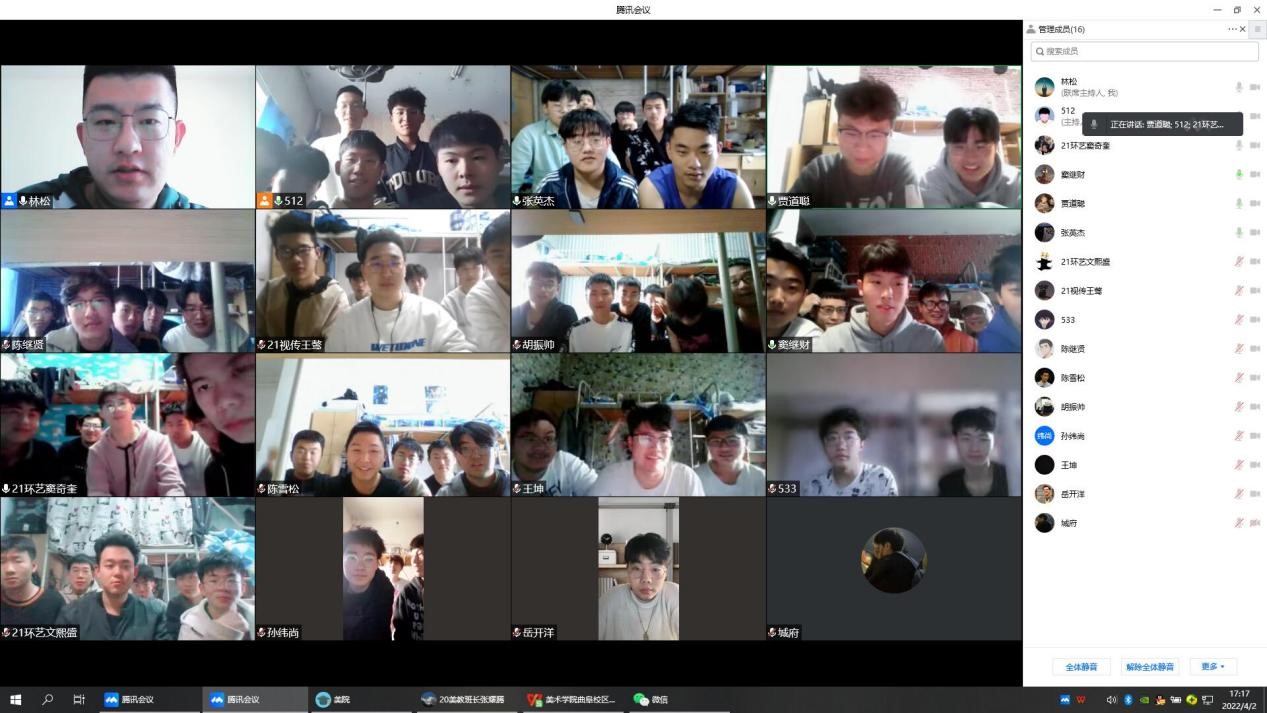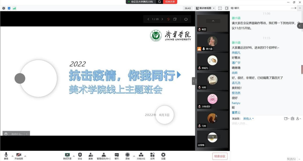 为全面了解学生疫情期间思想、学习、生活状况,维护学生心理健康,确保防疫期间学生安全稳定。4月2-3日,美术学院召开“抗击疫情,你我同行”线上主题班会,该院全体辅导员分年级组织,1300余名学生参加。