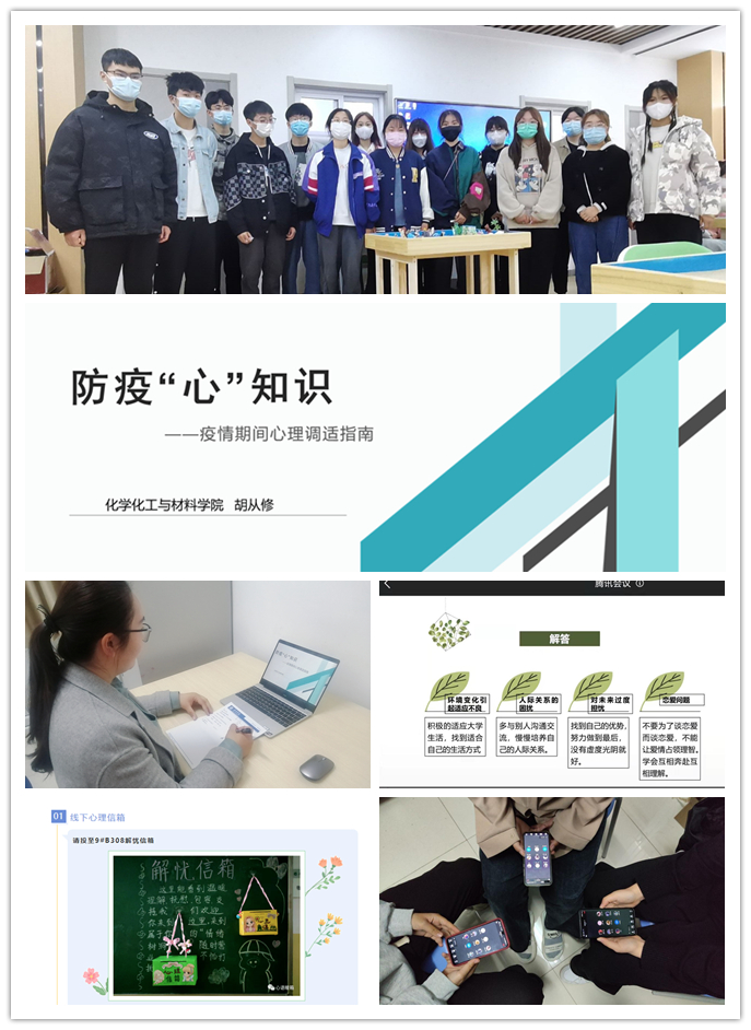 疫情反扑,校园封锁,守护学生心理健康更显得尤为重要。为响应和推进学校心理健康教育工作,增强大学生的心理自我保健和危机预防意识,化学化工与材料学院、“健”心工作室先后举办了团体心理沙盘游戏体验活动,“从信开始,从心出发”解忧信箱活动,进行了防疫心知识——疫情期间心理调适主题讲座。这些活动有助于化学化工与材料学院学生在封闭管理期间心理问题的解决,帮助学生们保持良好的心态,以更好的状态投入到学习和生活中去。同时也极大的鼓舞了学生们抗击疫情的信心,为实现校园早日解封,早日正常的学习工作奠定坚实基础。