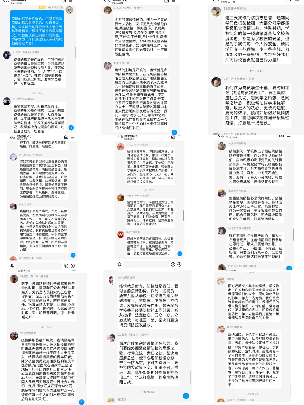 3月31日,曲阜市发现一例核酸检测阳性患者,面对突如其来的疫情,该院师生积极响应学校号召,进行全员核酸检测。在核酸检测的时间段内,为确保核酸检测有序进行,该院学生党员们利用自己的课余时间,到核酸检测处担任志愿者,登记同学们宿舍信息,引导现场人员保持一米间距,维持现场秩序,直到最后一位同学完成核检。有许多党员和入党积极分子虽然未能参与到一线的抗疫志愿活动中,但是他们积极配合学校防疫工作,纷纷在线上做出表态。住校党员老师与辅导员们不分昼夜,也积极参与到学校的防疫管理中来,用实际行动彰显党员的先进性。