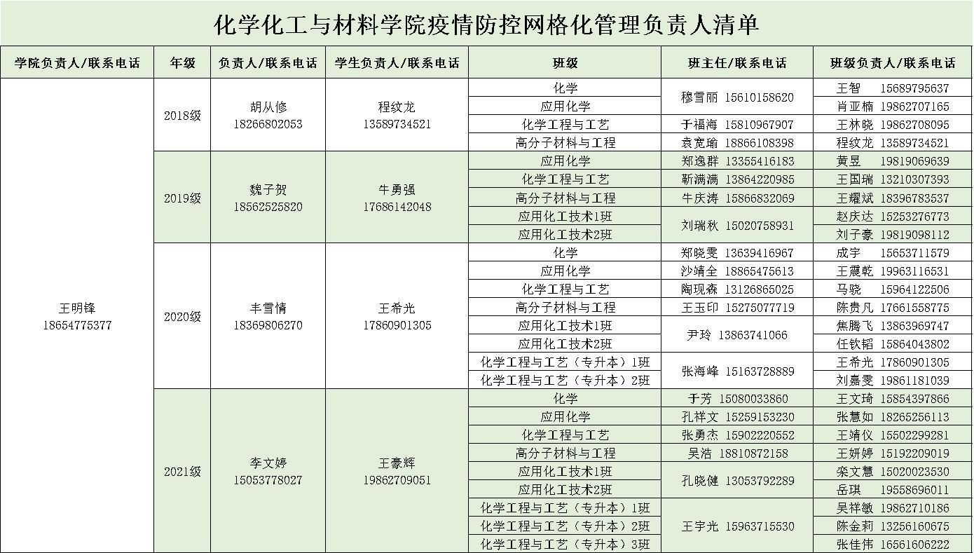 自学校封闭管理以来,化学化工与材料学院党委多次开展线上线下会议,深入学习习近平总书记的重要讲话。结合全省学校疫情防控工作会议的讲话精神,学校防疫工作会议的主要会议内容以及该院的实际情况,构建了疫情防控网格化管理制度,本着“谁主管、谁负责”的原则,构建“学院统筹、班级负责、全员参与”的疫情防控网格化管理格局。该院以分管学生工作的党委副书记为主要负责人,该院领导、辅导员、班主任、学生干部“四位一体”的管理模式,构建“学院-年级-班级-小组”四级网格化管理制度,负责该院的疫情防控工作。工作中明确任务,落实责任。各网格化管理负责人各司其职,各负其责,切实确保疫情防控工作的正常运行。严格落实责任追究制。按照“谁主管、谁负责”的原则,一级抓一级,层层抓落实。