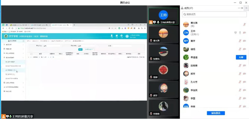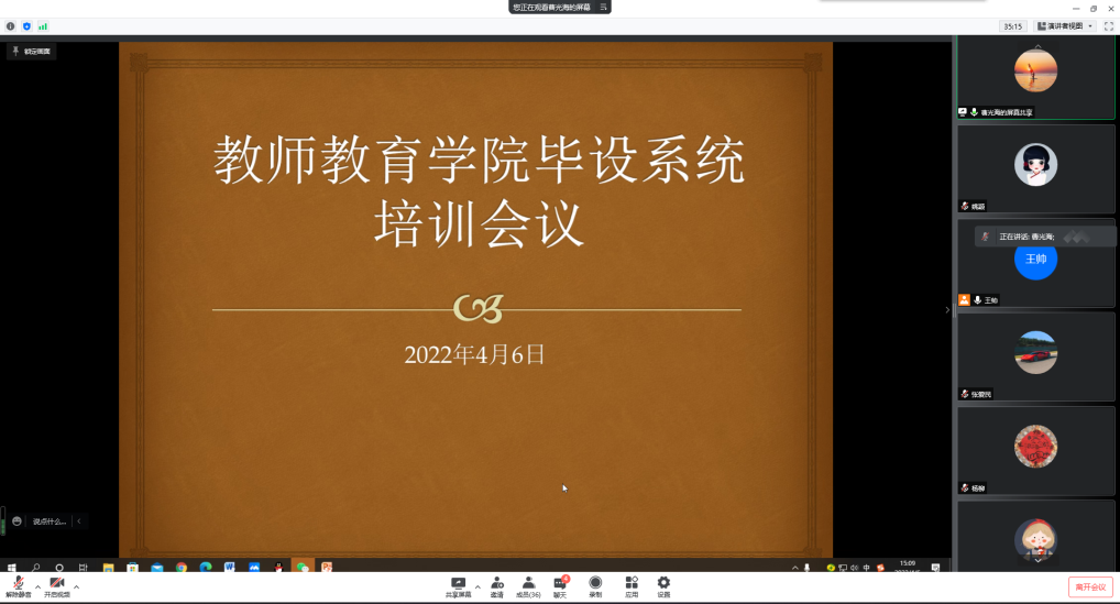 为加强教师教育学院本科毕业设计(论文)的规范化、信息化管理,帮助广大教师进一步熟悉毕业设计(论文)管理系统操作使用,保障2022届毕业设计(论文)工作的进度和质量,4月6日,教师教育学院面向该院教师组织了毕业设计(论文)系统操作使用线上培训会。会议由教师教育学院副院长曹光海主持,院长李群、副院长单清清、各专业论文负责人、论文指导教师等37人参加了培训。