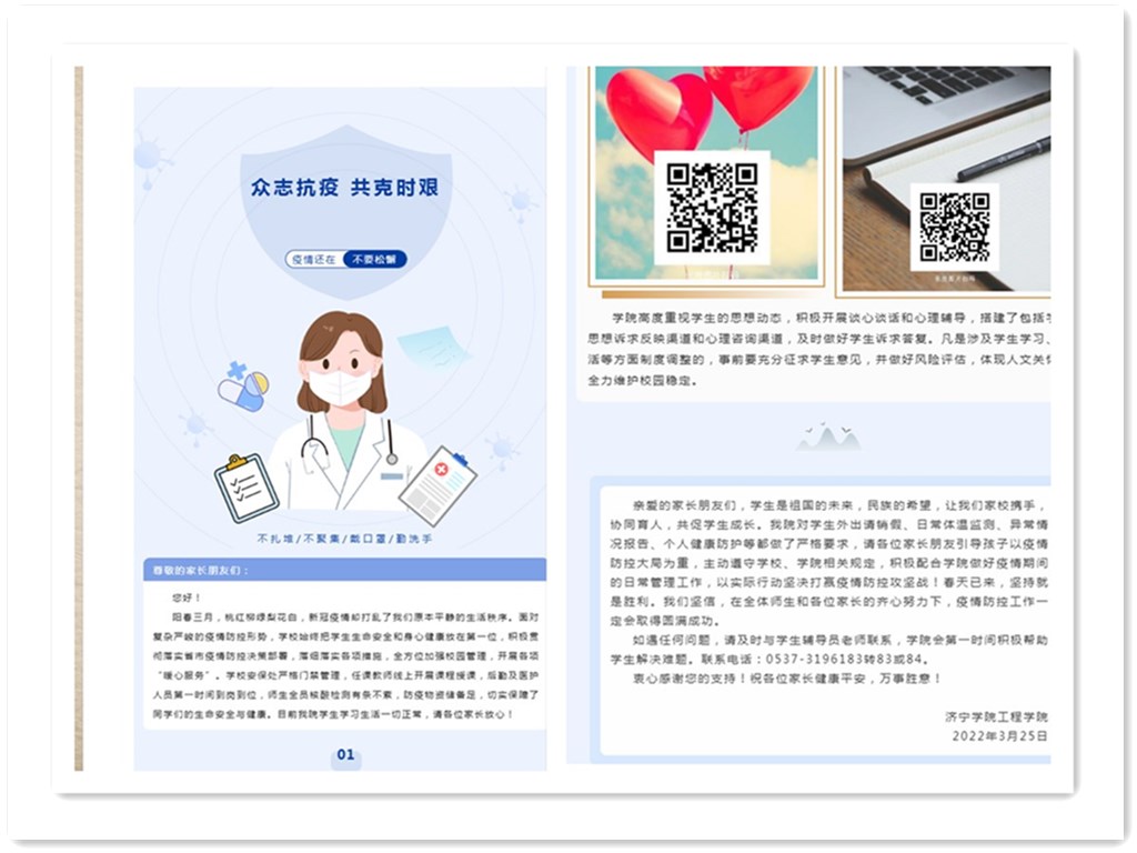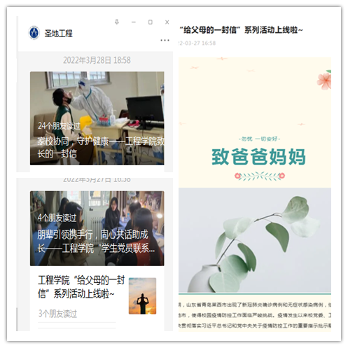 该院发出《家校协同 守护健康——工程学院致全体学生家长的一封信》,对学校的疫情防控政策和服务保障措施做出详细说明,同时号召家长积极引导孩子以疫情防控大局为重,自觉遵守学校、学院相关规定,积极配合做好疫情期间的日常管理工作,鼓励孩子认真上好网课,加强体育锻炼,积极参加志愿服务,以实际行动坚决打赢疫情防控攻坚战。该院还组织开展了“给爸爸妈妈的一封信”系列活动,号召学子们以文字或视频的方式,记录自己在校学习、生活、体育锻炼、志愿服务中的所见所闻、所历所获、所感所悟,向父母报一声平安,请家人放心。协同育人,同心抗疫,家校携手为学生营造了健康、安全、有序的学习和生活环境。