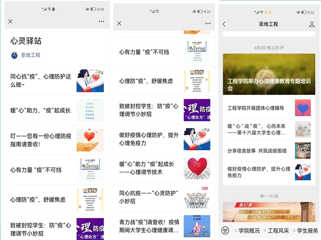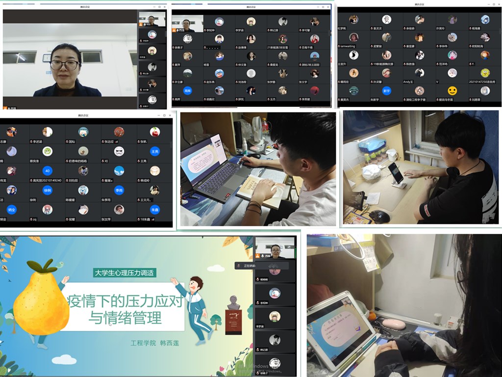该院还开展了“育心逐梦·助成长”心理育人系列活动,为疫情下学生心理健康保驾护航。在“圣地工程”微信公众号平台开辟“心灵驿站”专栏,每天一期,推送具有普适性心理辅导的暖文,发布各级心理援助资源等相关文章;举行“心理健康基本知识与助人技巧”培训会,帮助学生干部了解和掌握心理健康基本知识和助人技巧;对1号楼居住学生进行团体心理辅导,举行“疫情下压力应对与情绪管理”专题讲座,为学生讲解科普知识、实施心理减压,帮助学生学会应对压力的技巧;组织各班召开“心理防疫,从我做起”主题班会,帮助同学们提高心理自我调节能力,用积极心态面对疫情,从容应对当前形势下的学习生活;举办电影疗法团体辅导活动,引导同学们通过观摩及投射过程缓解自身的心理冲突,加深自我认识,实现人格的完善;开展“学生党员联系宿舍”活动,朋辈引领携手行,同心共话助成长;发起“我的宿舍卧谈会”活动,鼓励各宿舍积极开展有质量的卧谈会,营造自助互助的友好氛围;开展趣味运动会、线上运动打卡、广场舞大赛等活动,丰富同学们的生活,鼓励同学们以更好的身心状态去适应当前校园生活。