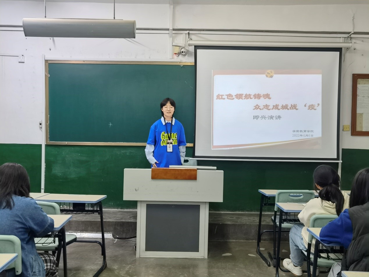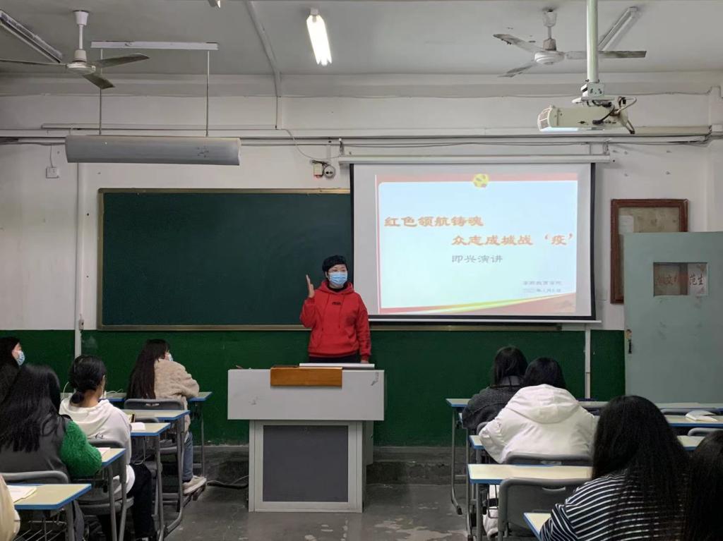 4月6日晚,学前教育学院以班级为单位开展“红色领航铸魂•众志成城战‘疫’”即兴演讲活动。辅导员通过线上与线下相结合的方式,深入班级为同学们讲述生命至上、举国同心、舍生忘死、尊重科学、命运与共的伟大抗疫精神。旨在引导青年大学生坚定战胜疫情的信心,激扬爱党爱国的青春力量。