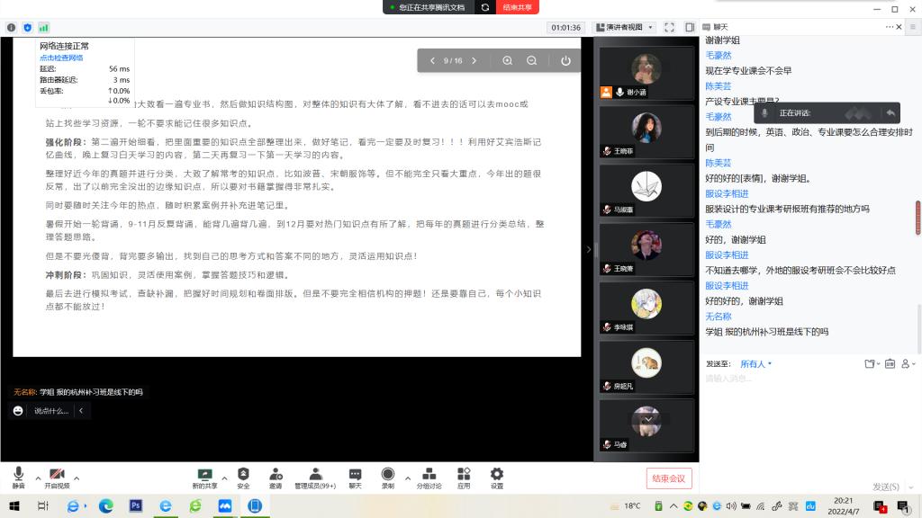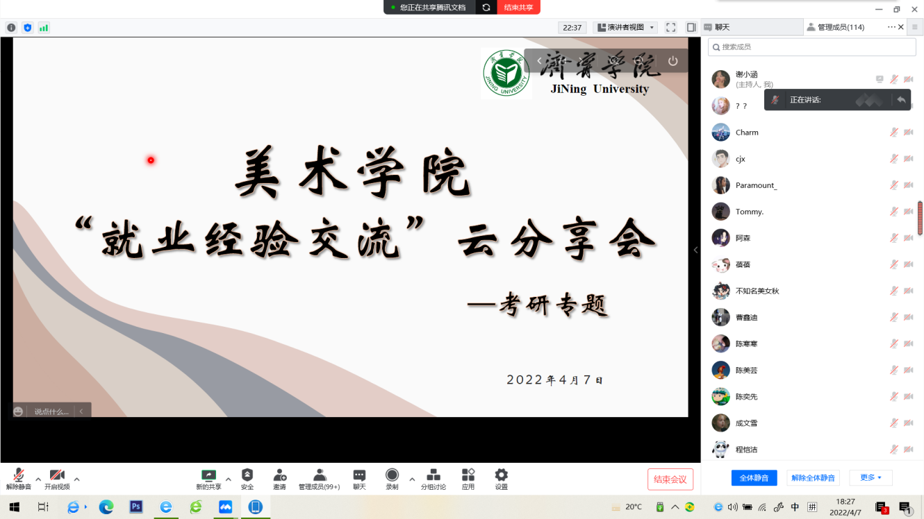 为增强学生考研信心,提升考研实战能力,4月7日,美术学院于腾讯会议线上平台举办了“就业经验交流”云分享会——考研专题。本次交流会由辅导员谢小涵主持,邀请了今年考研上岸的4名学生主讲,260余名学生参加。