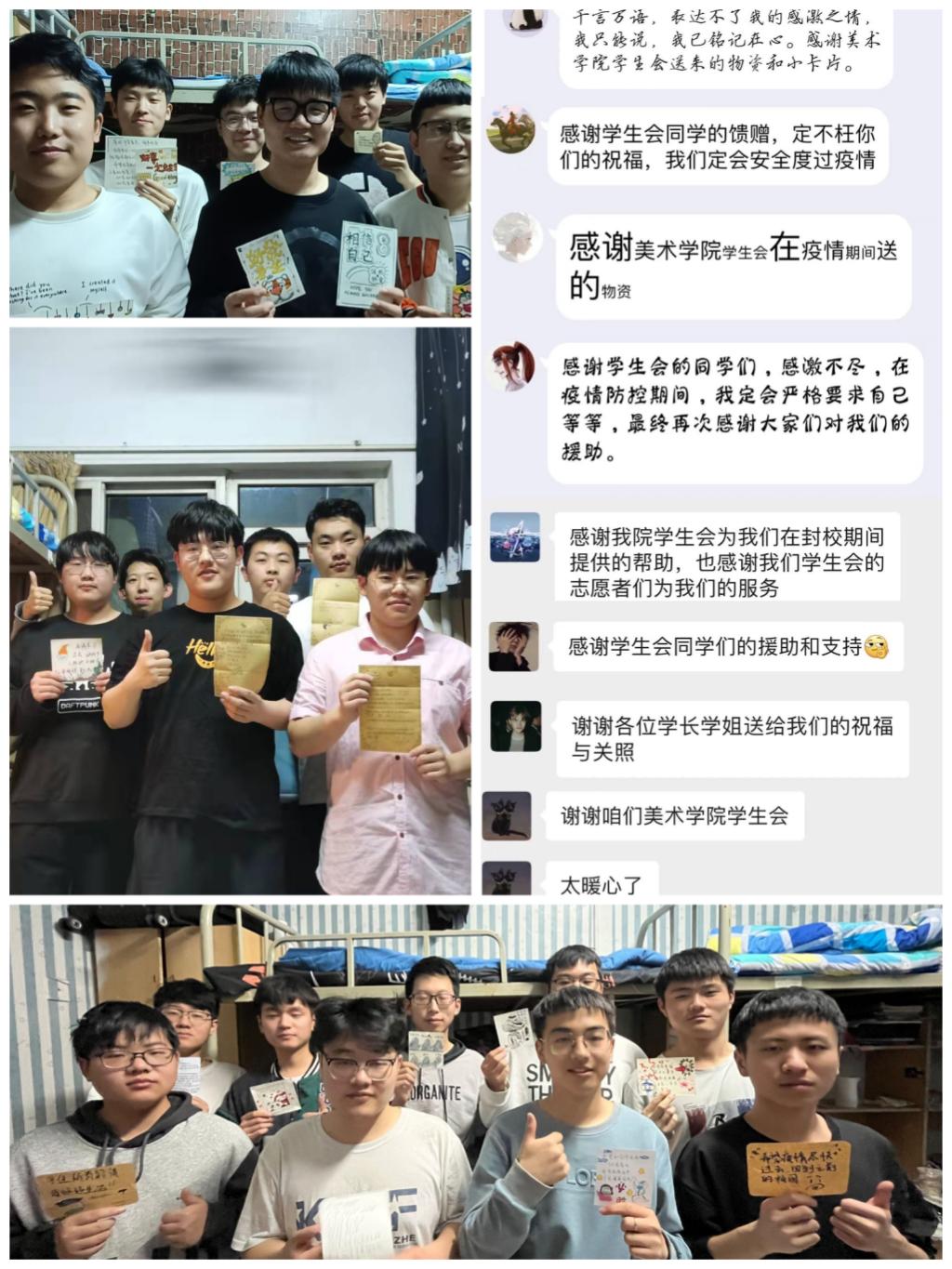 来自“身边”的惊喜。“疫情终将过去,静候春暖花开”“如约而至的,不仅仅是春天,还有疫情过后平安的你”“比病毒更快的一定是爱和希望”……4月7日,一号公寓楼86名美院学子收到了近百幅包含浓浓爱心的手绘卡片,这是美术学院学生会送来的鼓励与祝福。学生会还成立了“爱心小分队”,采购了生活用品,在驻楼志愿者的积极协助下,分发到了每一个宿舍,顺利完成了爱心传递,让同学们切身感受到来自集体的关爱与温暖,更加坚定了战胜疫情的决心与信念。