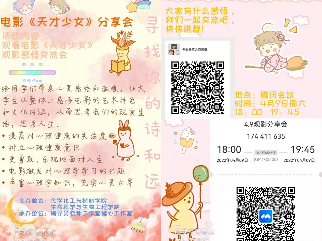 疫情封校期间,为了给学生们带来心灵上的感悟和温暖,让大学生从整体上感受电影的艺术特色和文化内涵,从而更好的帮助同学们感悟生活。4月9日下午6点,通过腾讯会议的形式,化学化工与材料学院和生命科学与生物工程学院联合开展了心理电影赏析活动。