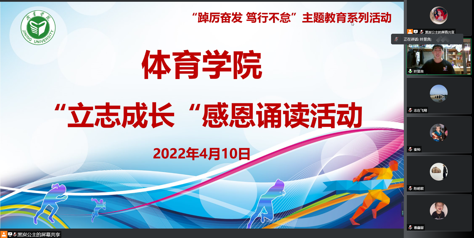 4月10日,体育学院通过腾讯会议举行“立志成长”感恩诵读活动,该院党委副书记辛允东、辅导员老师参加活动,2021级近50名学生参加比赛。