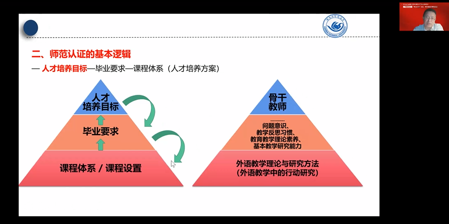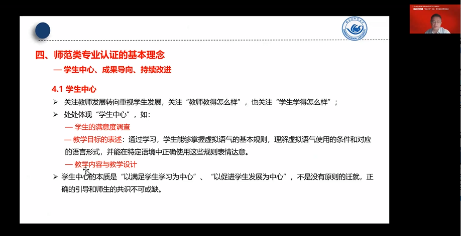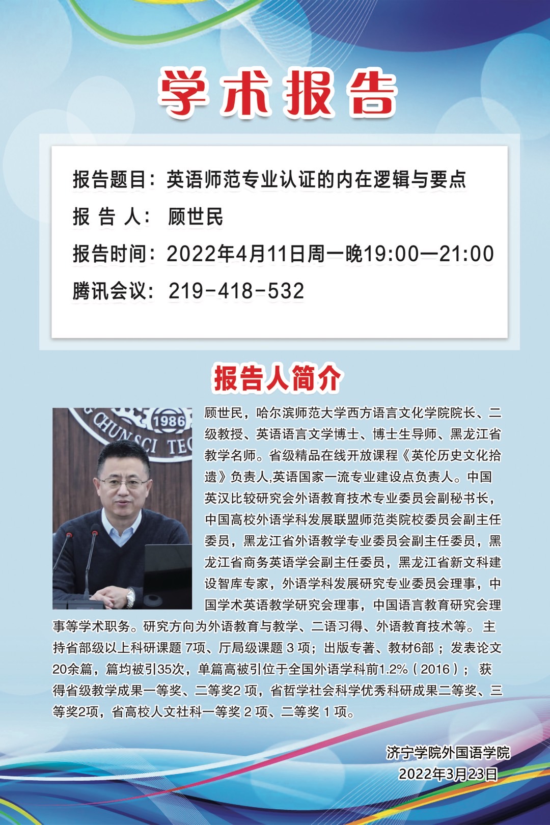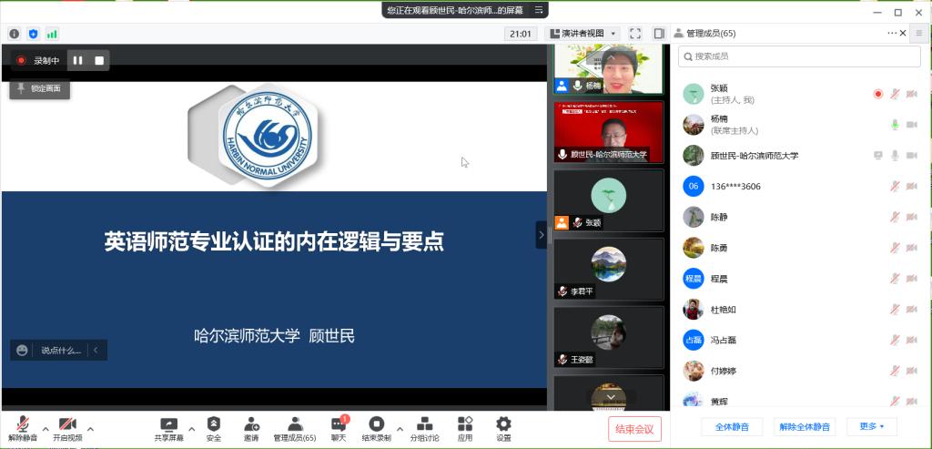 4月11日晚,哈尔滨师范大学顾世民教授应邀为外国语学院全体教师做了题为“英语师范专业认证的内在逻辑与要点”的线上讲座。本次讲座由外国语学院院长杨楠教授主持,外院全体老师通过腾讯会议参加了讲座。
