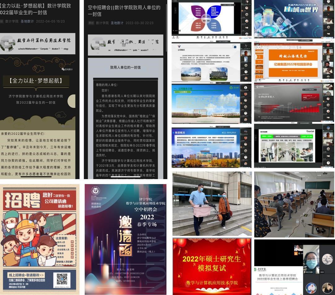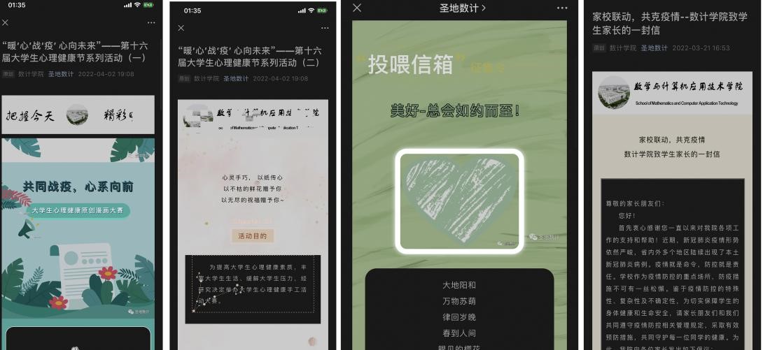 急学生之所急,想学生之所想,切实为同学们办实事、解难题,一个不落齐上阵。为了保证同学们在封校期间也能参加国家级IT类赛事,学院克服种种困难,共为参赛选手打造了包括智慧教室、封控宿舍在内的9间标准化比赛场地,也为学生搭建起了冲向高级别专业赛事的平台;线上举办2022年研究生模拟复试,帮助考研学生掌握技巧、增强信心;做好毕业生就业服务工作,举办2022年首场春季专场空中招聘会,10余家优质企业带着100多个岗位参会选才;官方微信推送“致毕业生的一封信”,开展求职就业指导;开展针对疫情防控的心理健康主题教育,举办心理健康节系列活动,如心理健康原创漫画大赛、心理健康手工征集活动等,帮助同学们调适心情、提高身心免疫力;设立“数计投喂信箱”,倾听学生心声,全面了解同学们学习情况、生活需求和心理状态;组建心理支持志愿服务队,对学生心理健康状况进行动态检测,针对心理咨询求助学生制定针对性干预方案,分层分类做好学生的心理调适辅导;官方微信公众号适时推出“致家长的一封信”,向家长们通报学校教育教学安排及学生在校学习生活状况,缓解家长因封校管理而产生的焦虑心理,建立良好的学校、学生、家长互动关系。