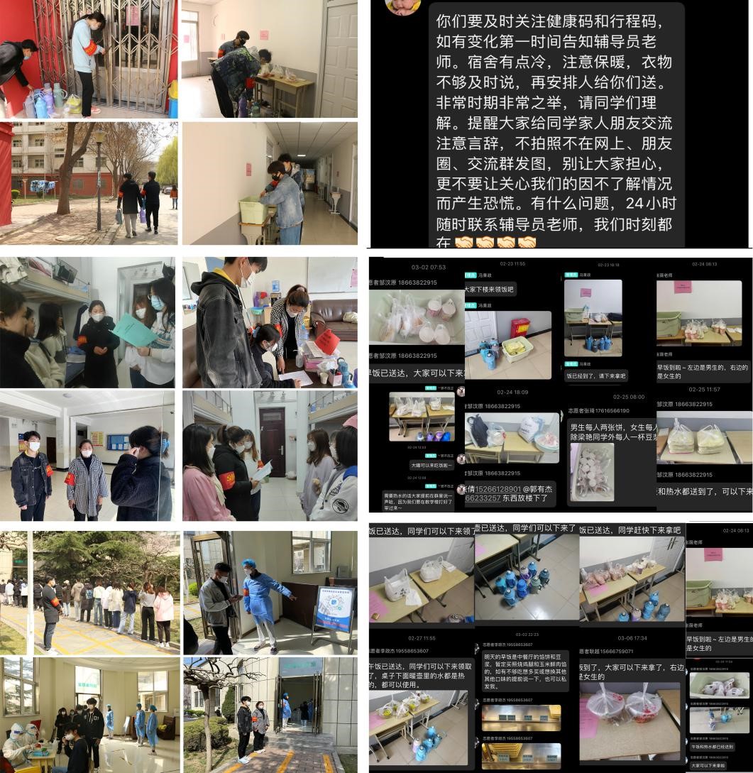 多个夜晚,许杰等仔细查看学生宿舍的疫情防控、清洁卫生、用电安全等方面的情况,详细询问同学们在学习、生活、毕业就业、心理健康、人际关系等方面是否遇到困难。许杰书记在校两周,轮休后无法进校,每天心急如焚,一天好几个电话实时了解情况、把握动态;党委副书记张静深入抗疫工作一线,到核酸点维持秩序、组织学生,与学生谈心谈话,连夜处理学生各类突发状况,同时还要把握院系党建、学团、学生心理健康、毕业生就业、实习实训等各项工作顺利开展。辅导员老师们排除困难,积极入校。冯秉政、陈轶洋、李德法、张薇在校工作,至今1天没休;孔晓霞夫妻共同奔赴抗疫一线;张伟把不满两岁的孩子托付给亲戚选择返校;张颖、史勤政坚守高新区大学园兢兢业业;范建田、郑伟抛下两个年幼的孩子进驻大学园工作;王都、王昊睿、闫卓敏、王蒙蒙因特殊原因被封在家里,但始终与在校师生同频共振、各项工作从不掉队。他们知道,越是在特殊阶段,越是要倾注更多精力,保证常规工作做得温暖、做得出彩,帮助学生平稳度过难关。