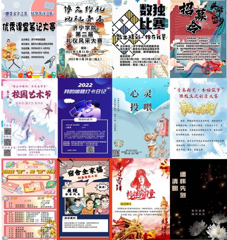 青山一道同云雨,明月何曾是两乡。2021级应用数学专升本12名援疆支教的同学在喀什送来了遥远的祝福;官方微信也陆续推送了“慰一襟风尘·育桃李繁花”系列支教风采展,让济园的同学也可以领略喀什的风光;“同心战‘疫’,同‘屏’共振——数计学院小葵花空中影院”每天精心选取2部电影,陪伴同学们度过封控的时光,为大家注入温暖和力量;清明节时,学院官方微信推送“英魂不朽·号角长鸣”系列,同学们一起在线上缅怀革命先烈;在学习雷锋精神月组织“无烟校园”活动,大家用实际行动向雷锋精神致敬;还有博文约礼·风雅青春——亚星在线登录官网第二届礼仪风采大赛、数独比赛、优秀课堂笔记大赛、网络科技节“编程打卡”活动、“英雄征集令”线上抗e创意运动视频、“暖心打卡全家福,定格济园好时光”宿舍全家福摄影大赛等各种活动,丰富多样、涵盖面广,既彰显专业特色,又富有年轻活力。