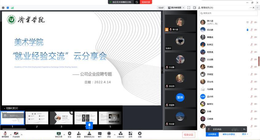 为进一步提升毕业生求职技巧,促进学生高质量就业,4月14日,美术学院于腾讯会议线上平台举办了“就业经验交流”云分享会——公司企业应聘专题。本次交流会特邀两名顺利签约的应届毕业生作为主讲嘉宾,辅导员谢小涵及180余名学生参加了此次活动。