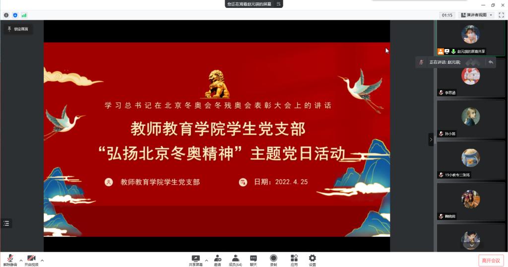 为弘扬北京冬奥精神,激励党员奋进奉献,4月25日下午,教师教育学院学生党支部通过线上线下相结合的形式,开展“弘扬北京冬奥精神”主题党日活动。