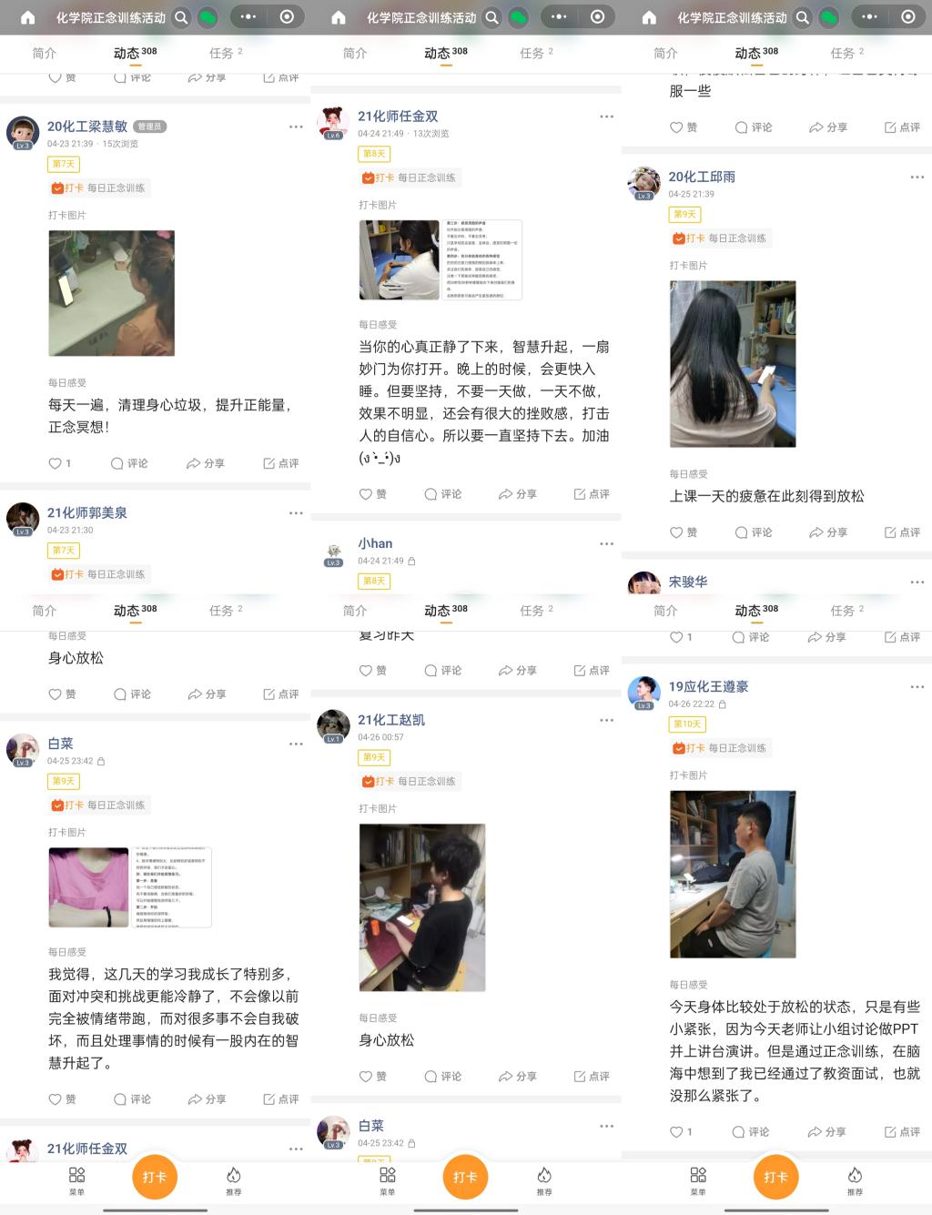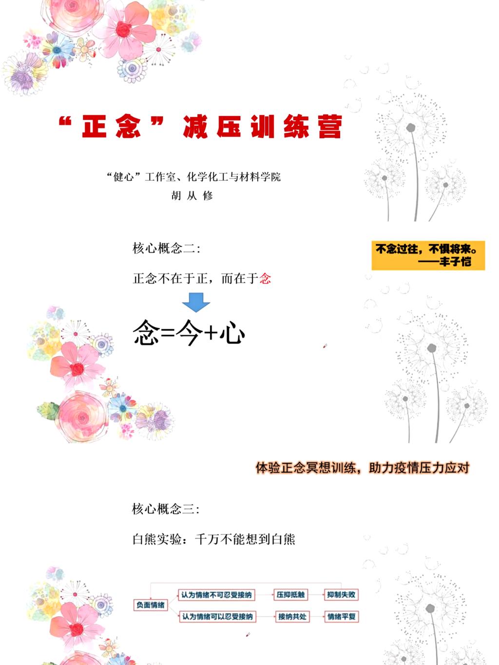 疫情防控下,为帮助学生缓解日常压力,调整负面情绪,化学化工与材料学院健心工作室于4月17日至26日开展了为期十天的“正念减压”训练活动,学习与安放身心的技能方法。该活动由辅导员、国家二级心理咨询师胡从修主领。