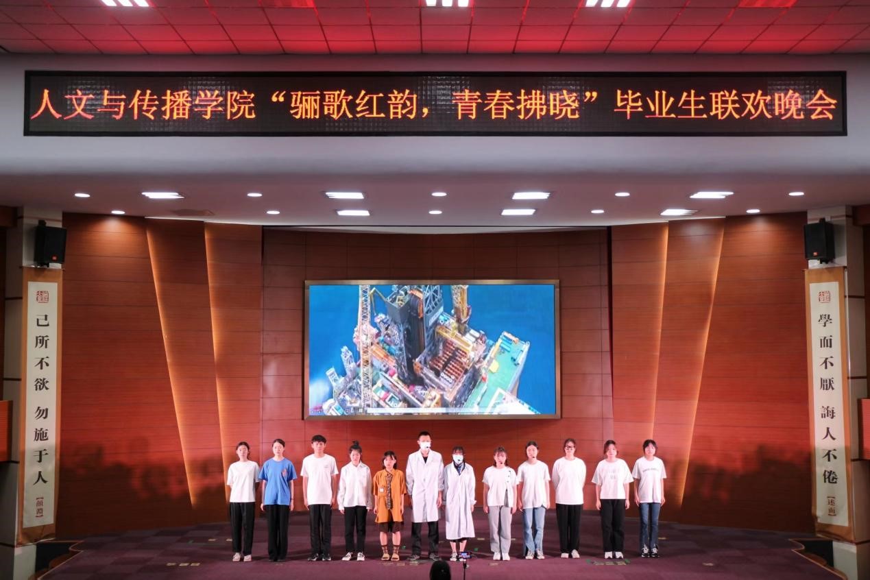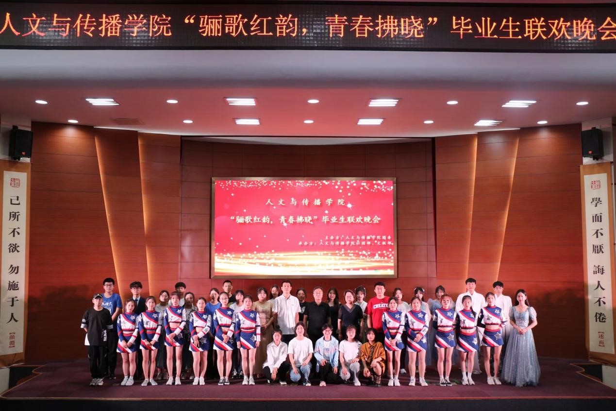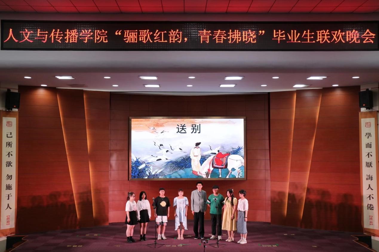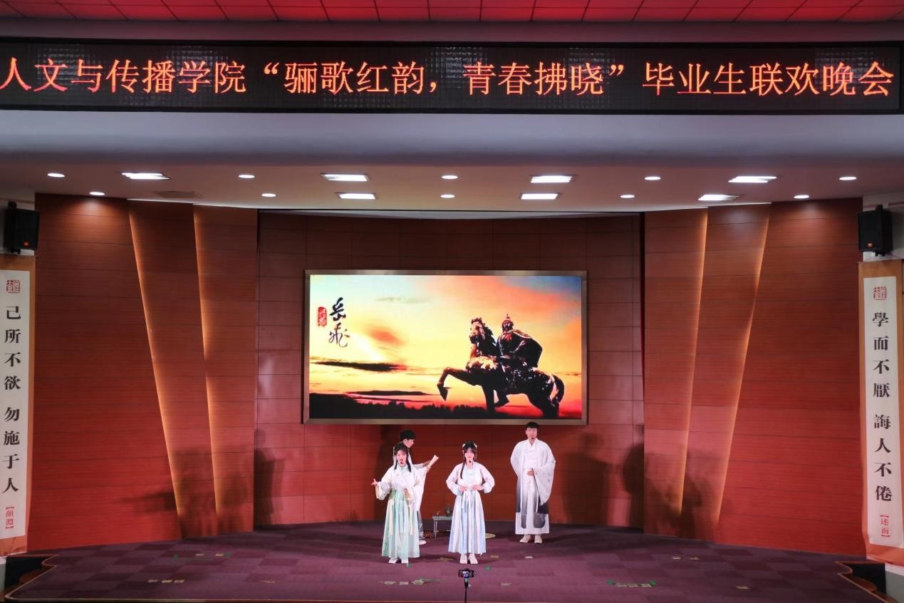 节目在歌曲《忽而今夏》中开场,拉开本次晚会的序幕。舞蹈《trouble maker》以热情似火的舞姿,展现着青春的激情和力量;毕业生代表朗诵《中华颂》,以完美的音色和饱满的情感表达了青年对祖国的满腔热爱,展现新时代青年的理想;随后,人文与传播学院啦啦队带来舞蹈《一起向未来》,明快的节奏和活泼的舞步相映,瞬间燃爆全场;诗词朗诵《千古多少事,尽揽诗词中》,吟唱文化精粹,舞动民族神韵,尽展该院学子风采;春雷话剧社带来的话剧表演《林深见陆》,前生今世梦里交织,抗战与抗疫故事融合演绎,在国家危难之前,总有人挺身而出,为我们负重前行;最后,由21级学生代表合唱《送别》、《下个路口见》,动听的歌声将我们的思绪再次拉回到单纯美好的校园生活,唱出多少少年事,唱出多少不舍情,为毕业学子送上声声祝福。