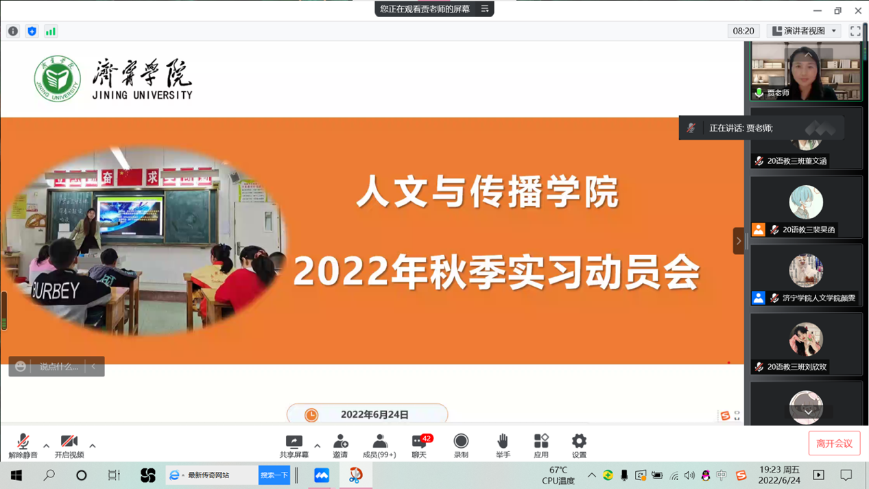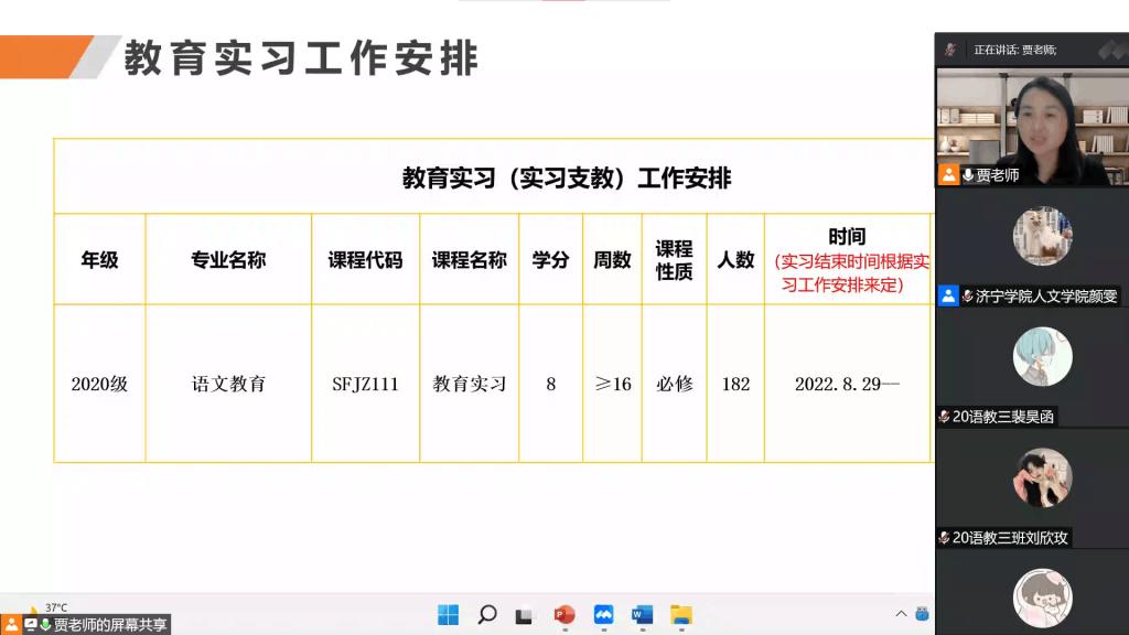 为做好语文教育专业学生的实习支教工作安排,推进实习支教工作顺利开展,6月24日晚,人文与传播学院通过腾讯会议平台召开了2022年秋季实习支教线上动员会。该院副院长贾英侠、辅导员颜雯以及2020级语文教育专业182名同学共同参加本次动员会,会议由颜雯主持。