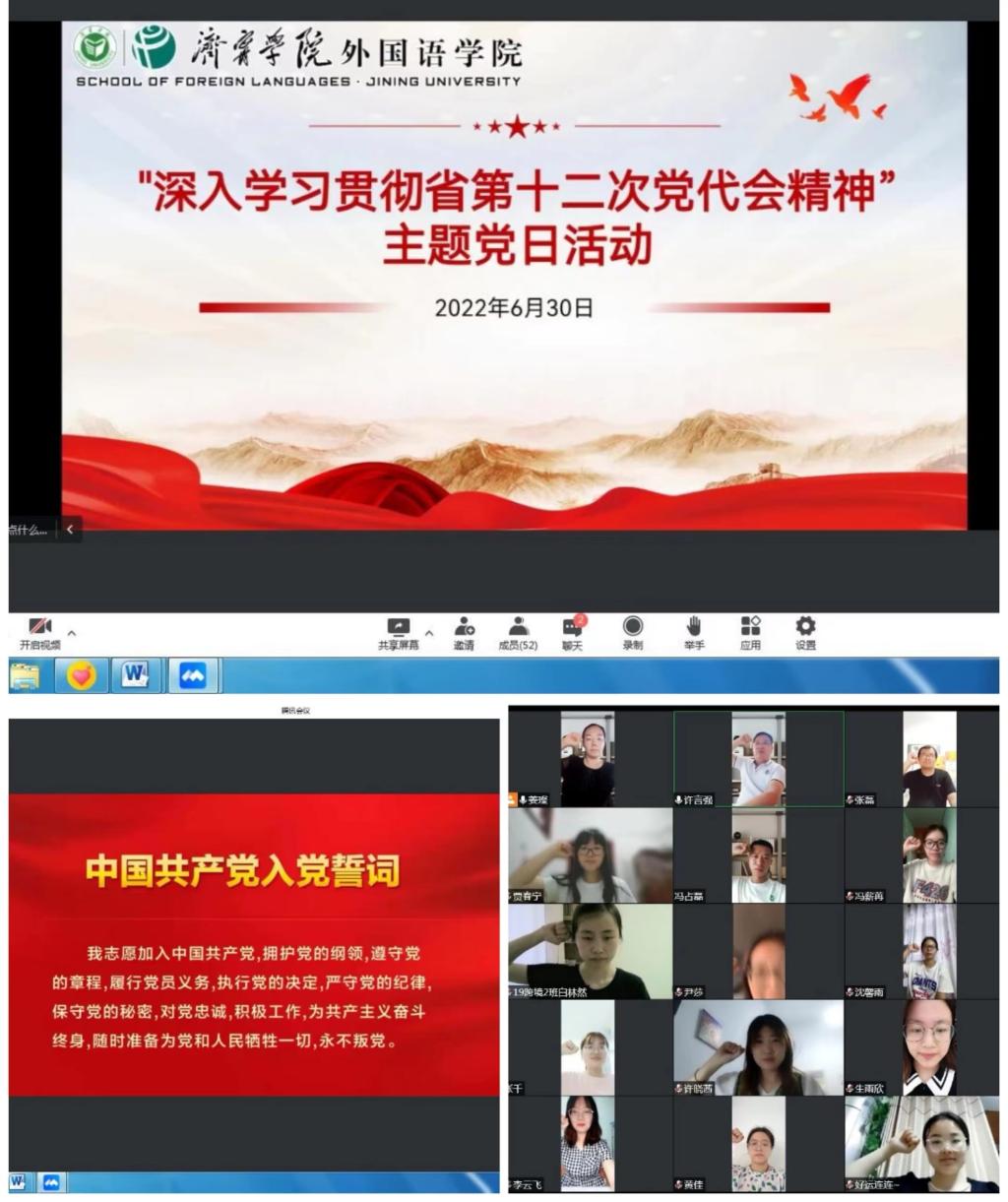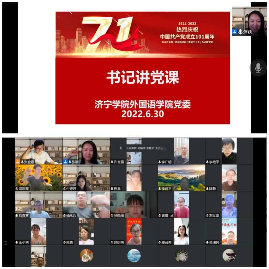 6月30日晚,外国语学院教工党支部利用腾讯会议开展“书记讲党课”活动并重温入党誓词。学院党委书记陆波、副书记许言强、教工党支部书记张颖以及全体教工党员参加,会议由教工党支部书记张颖主持。