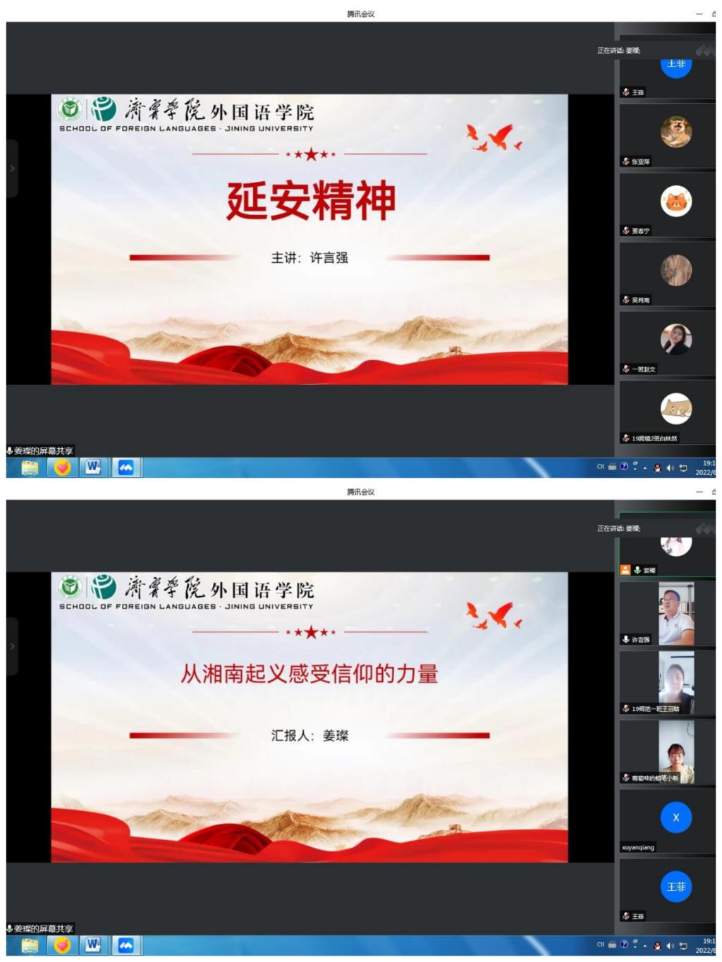 7月7日晚,外国语学院教工党支部通过腾讯会议开展了线上“多语种唱红歌”主题党日活动,学院党委书记陆波、副书记许言强、教工党支部书记张颖以及全体教工党员参加,会议由教工党支部书记张颖主持。