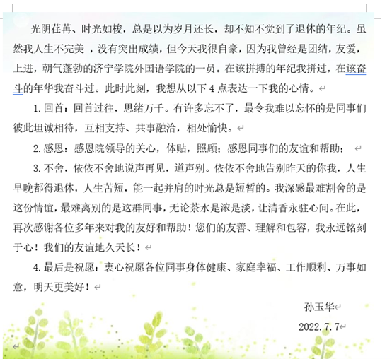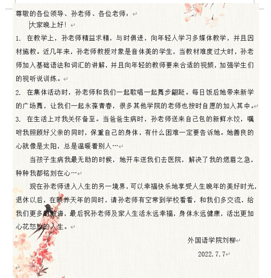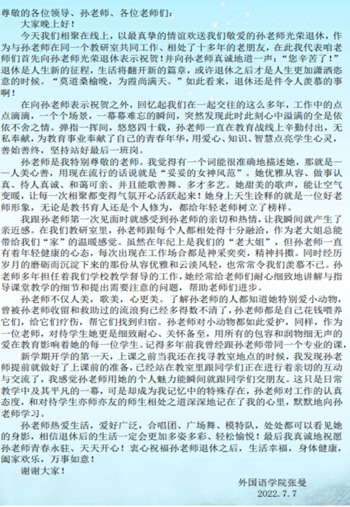 随后,退休教师孙玉华用“回首、感恩、不舍”总结自己的教学生涯和退休感受,她说“我深感最难割舍的是这份情谊,最难离别的是这群同事,无论茶水是浓是淡,让清香永驻心间”。随后张曼、刘柳两位教师代表诉说了同孙玉华老师不舍的同事情、亲情。张曼老师说道,孙老师一直在教育战线上辛勤付出,无私奉献,为教育事业奉献了自己的青春年华,用爱心、知识、智慧点亮学生心灵,善始善终,坚持站好最后一班岗。刘柳老师激动地回忆道:“当孩子生病在我最无助的时候,她开车送我们去医院,解决了我的燃眉之急,种种我都铭刻在心”。伴随着孙玉华老师《今天是你的生日,我的祖国》优美的歌声,其他老师也在线上为孙老师送上了美好的祝福。